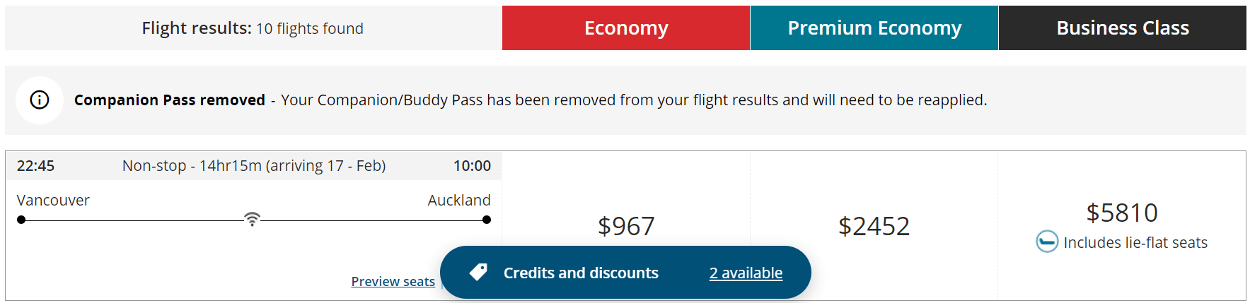 To use the Companion Pass, simply search for cash flights for two people on Air Canada’s website. At the bottom of the screen, you’ll see a “Credits and discounts” blurb, which you’ll need to click on.