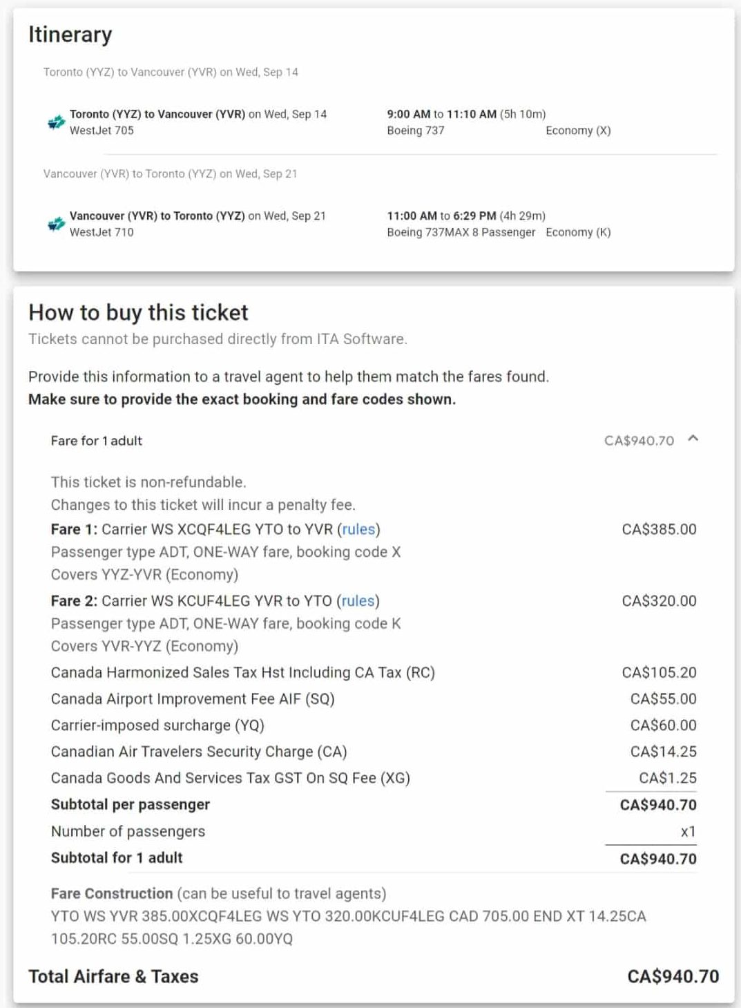 The total fare prices out at around $940, as broken down on ITA Matrix.