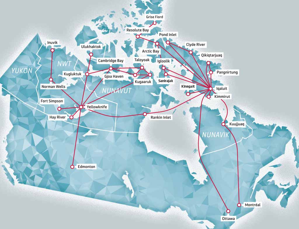 You can travel on Air Canada (which serves Whitehorse and Yellowknife), Calm Air (which serves northern Manitoba and parts of Nunavut), and Canadian North (which serves large parts of Northwest Territories and Nunavut).