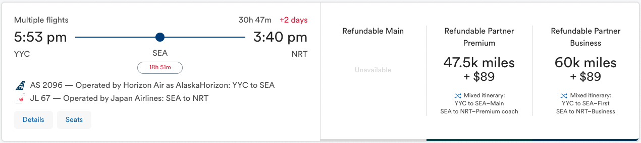 So if you wanted to fly Japan Airlines business class for 60,000 Alaska miles one-way, you could book Calgary to Seattle on Alaska Airlines, followed by Seattle to Tokyo on JAL, all on one ticket.