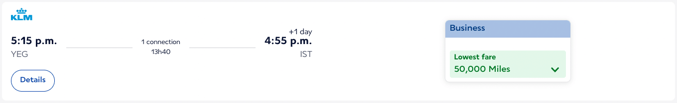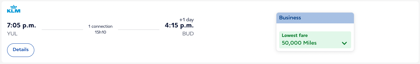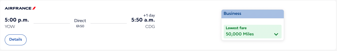 While the standard business class pricing of 50,000 miles looks good on paper, you’ll want to factor in the 1:0.75 transfer rate from American Express Membership Rewards to Flying Blue, which is the most meaningful way to access the program in Canada.
