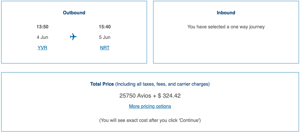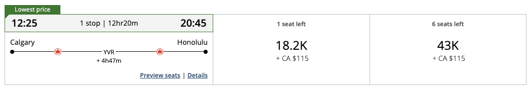 It’s also possible to find this price on the Seattle–Tokyo route, which is something to consider since award availability is quite difficult to come by these days. In fact, you’ll have to search for ANA award availability on another website (such as United MileagePlus), and then call the Aeroplan Contact Centre to book it, since ANA awards aren’t showing as available on the Aeroplan website these days.