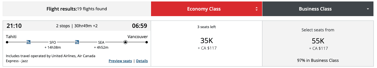 Another excellent Aeroplan sweet spot from Western Canada is flying from Vancouver to Papeete via San Francisco. If you’re able to find award availability (which will likely be at the last minute), you can score a seat in business class for just 55,000 Aeroplan points.