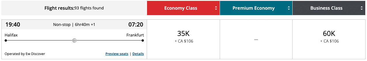 If Air Canada’s dynamic pricing skews the prices higher, then keep an eye out for the Discover Airlines flight that connects Halifax with Frankfurt. A non-stop flight between the two cities, which offers a lie-flat business class seat, is fixed at 60,000 Aeroplan points.