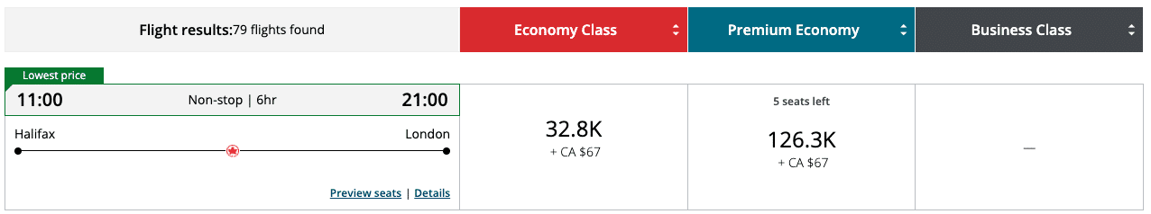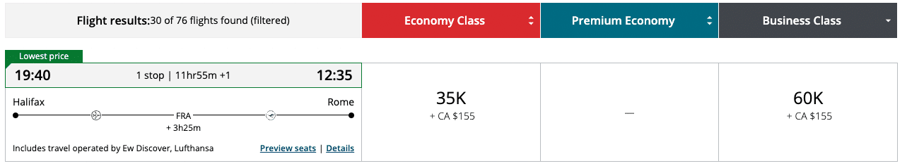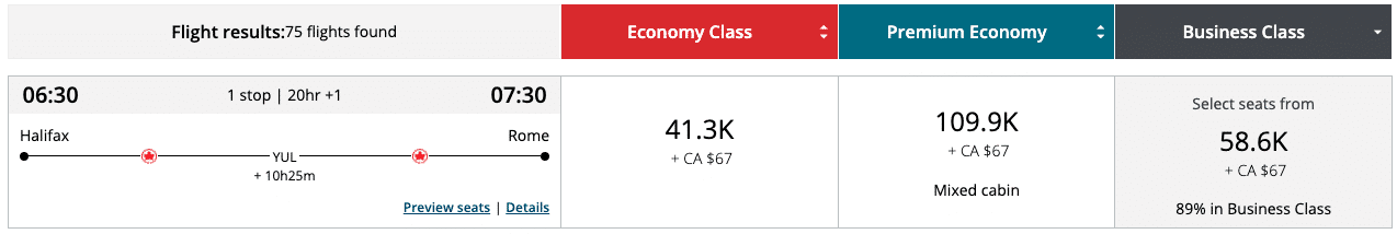 In the below example, 58,600 Aeroplan points in business class from Halifax to Rome via Montreal is great value, even with the first flight being in economy.