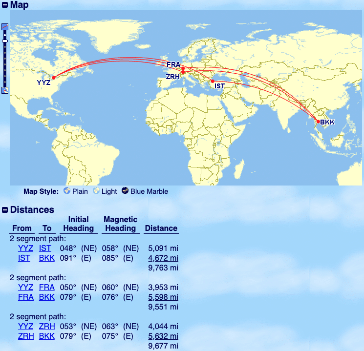 Furthermore, it’s a lot easier to take advantage of the “Asia 3” sweet spot from Toronto, and there’s a wide range possible stopover points en route to the Pacific zone while remaining under 11,000 miles in distance flown.