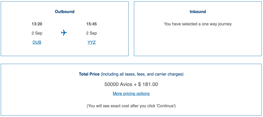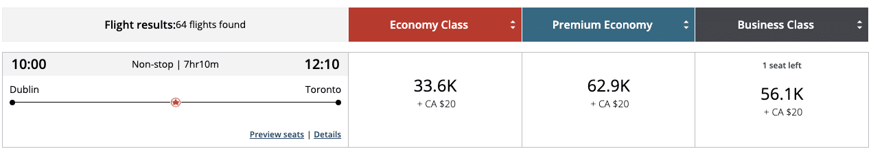 The distance-based award chart means that the Toronto–Dublin route is quite a compelling sweet spot, since an economy class flight can be booked for as low as 20,000 Avios one-way on off-peak dates.