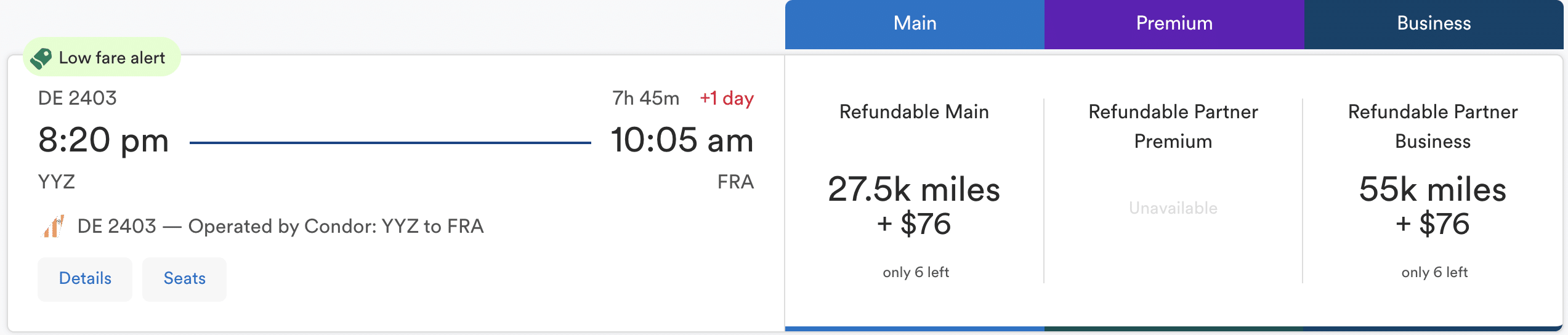 As always, you’ll want to keep an eye out on the monthly Promo Rewards, which have featured Montreal and Quebec City in the past. A 25% discount in business class brings down the cost to just 37,750 miles, or just over 50,300 Amex MR points with the transfer rate taken into consideration.