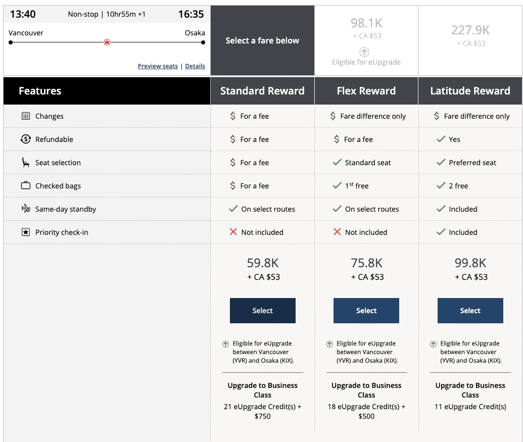 If you have Aeroplan Elite Status, and therefore eUpgrades at your disposal, be sure to consider Air Canada’s seasonal Vancouver (YVR) – Osaka (KIX) route, which runs between May and October. Unlike the Tokyo routes, it’s much easier to eUpgrade availability to Osaka, especially in the hot summer months.