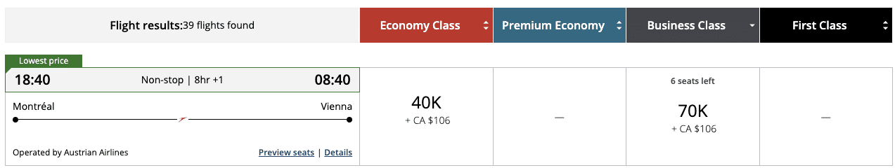 In terms of Aeroplan redemptions, the daily flight from Montreal to Zurich on Swiss is certainly a fan favourite, as is the 3x weekly flight to Vienna on Austrian Airlines. These flights can be booked for 60,000 or 70,000 Aeroplan points in business class, respectively.
