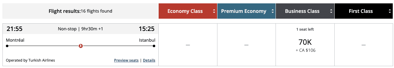 A few more good ideas include the 3x weekly flights from Montreal to Istanbul on Turkish Airlines or from Montreal to Lisbon on TAP Air Portugal, as award availability on these flights is often easier to come by than the airlines’ Toronto or Vancouver services.