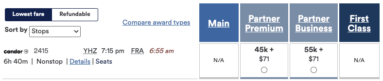 Besides those options, you’ll typically have to route through Toronto, Montreal, or US hubs to get on a reasonably priced partner award in business class or First Class.