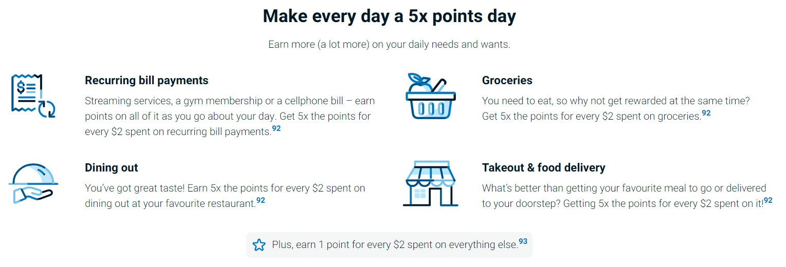 - 5 points per $2 spent on recurring bills, groceries, dining, and takeout