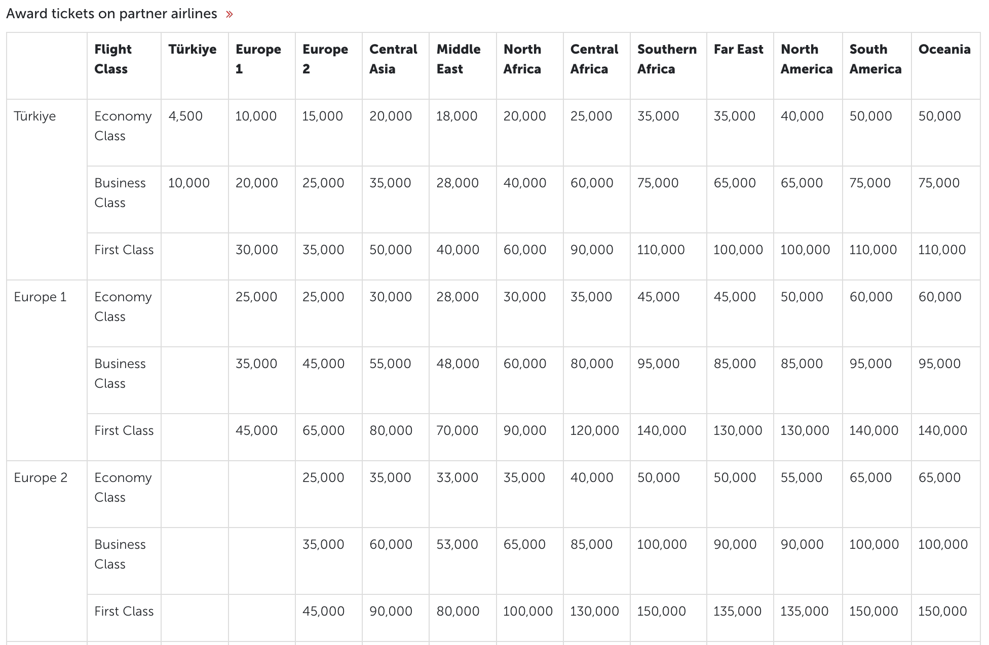 Turkish Airlines also published an “Award Tickets” chart for flights exclusively with Turkish Airlines, which offered access to more seats at a higher price.