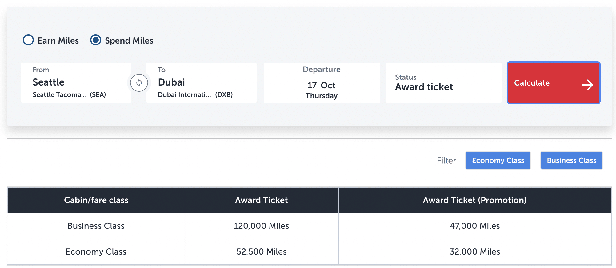 Heading a bit further afield to the Middle East, the cost jumps up slightly to 47,000 miles for a one-way flight in business class.