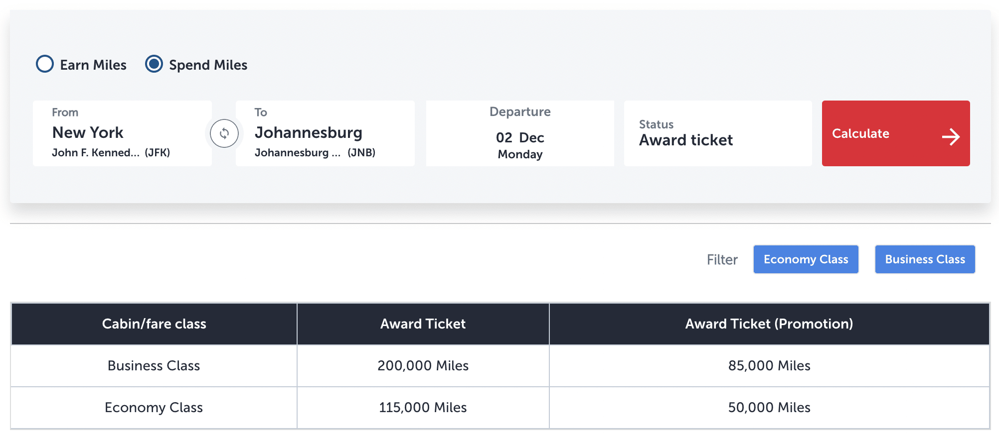 - One-way business class flight from Southern Africa to North America: from 85,000 miles to 140,000 miles (65% increase)