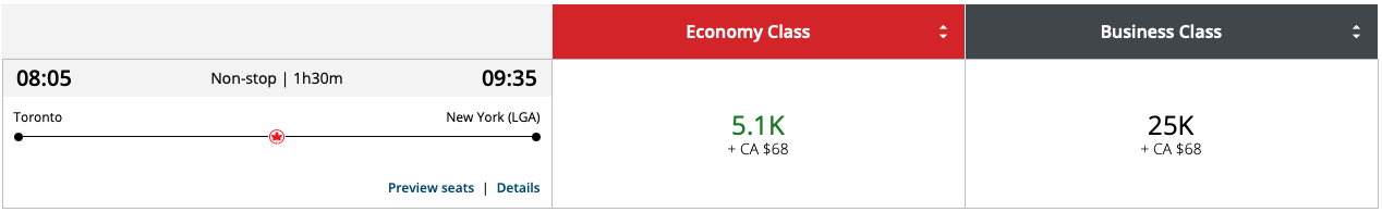 When redeeming points for flights to the US, Aeroplan charges 6,000 points in economy class or 15,000 points in business class one-way for flights up to 500 miles. Between 501 and 1,500 miles, Aeroplan charges 10,000 points in economy class and 20,000 points one-in business class, one-way.
