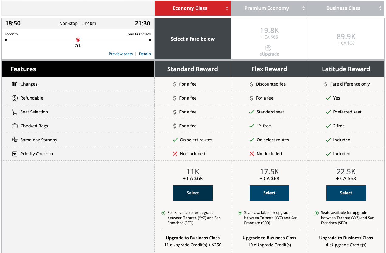 Longer transcontinental routings such as Toronto–Los Angeles would cost 12,500 points in economy class and 25,000 points in business class, one-way. Given that many of these are operated with lie-flat seats, it’s worth splurging your eUpgrades with a little extra effort using the “Latitude Attitude”.