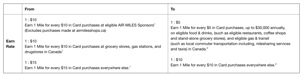 1 Air Mile for every $5 spent on eligible food & drinks and eligible gas & transit in Canada, up to a maximum limit of $30,000 per year