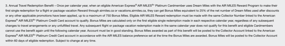 In addition to the increased earning rates, the Amex Air Miles Platinum is also introducing an Annual Travel Redemption Benefit, which gives you a 25% mileage rebate when you redeem Air Miles Dream Rewards for a flight or package vacation, once per calendar year. The rebate is limited to 750 Air Miles.