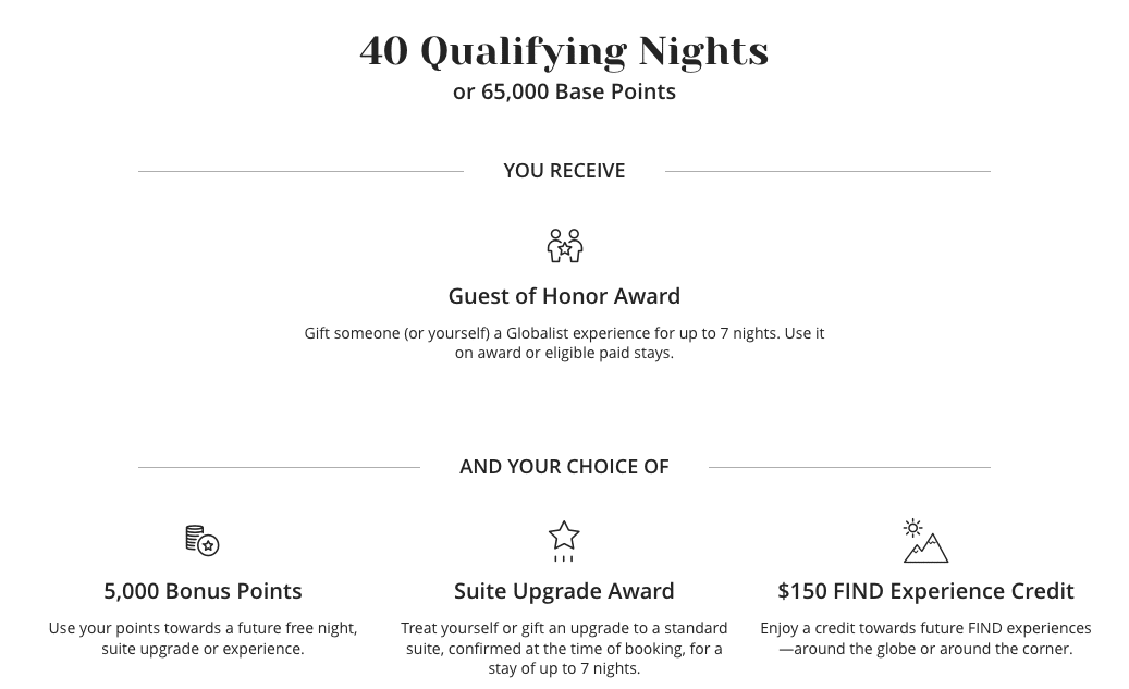 Crossing the threshold to Globalist status requires 60 nights or 100,000 Base Points; however, you’ll earn a Guest of Honor Award at 40 nights or 65,000 Base Points, while you’re an Explorist member. You could then gift it to yourself on a stay to get a taste of the Globalist treatment, or award it to someone of your choosing.