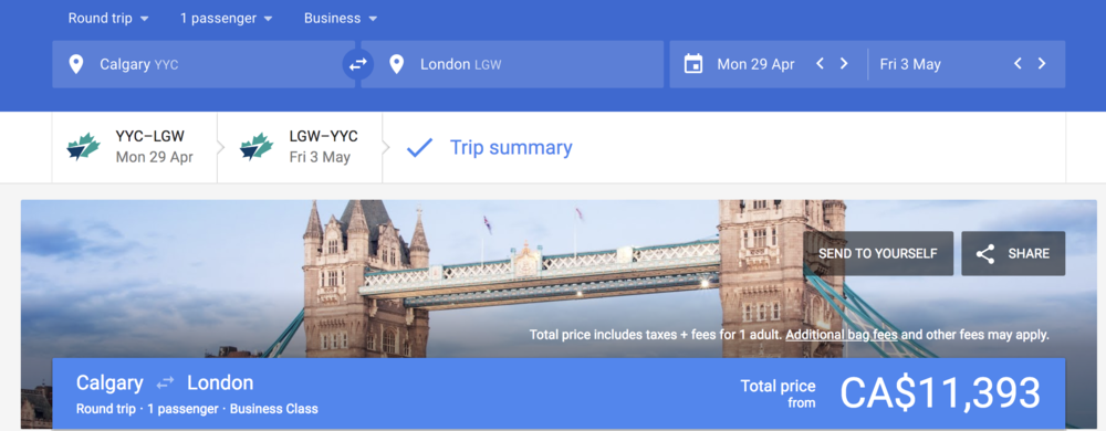 In the opposite direction (from Europe to Calgary), there seem to be quite a few decent discounted business fares still available: