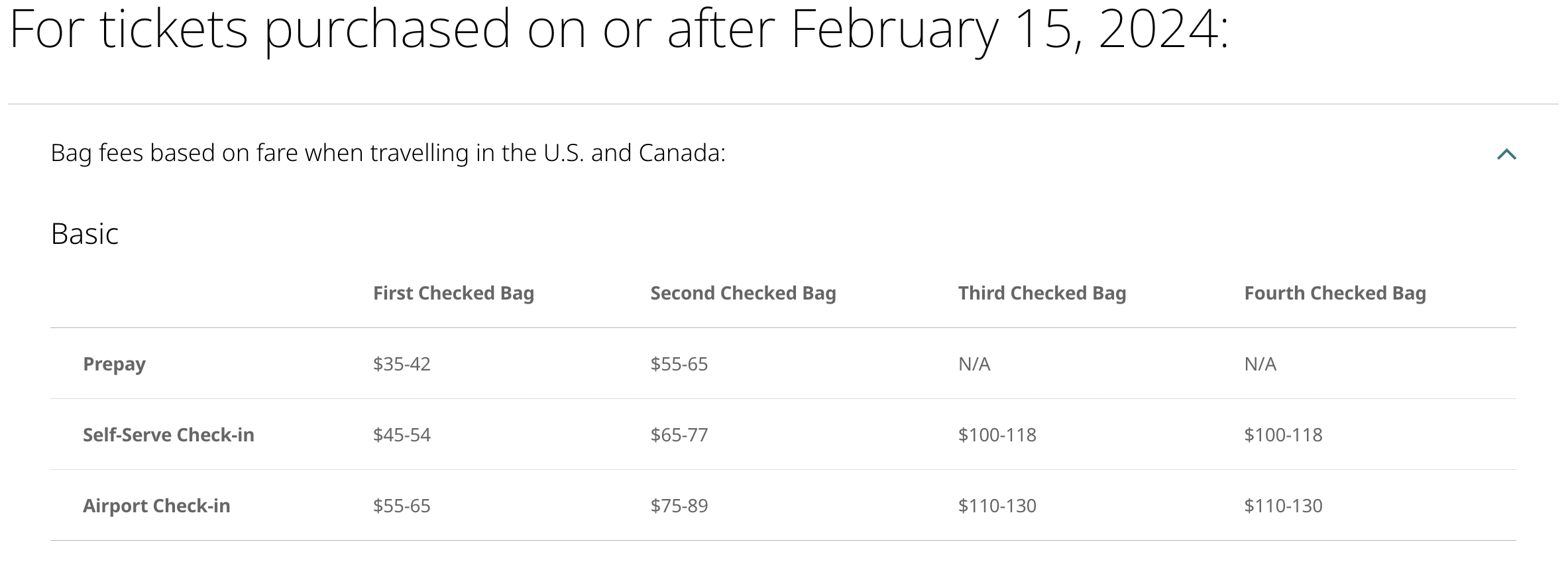 However, as of February 15, 2024, the fees have increased to the following levels on Basic fares for flights within Canada and to the United States: