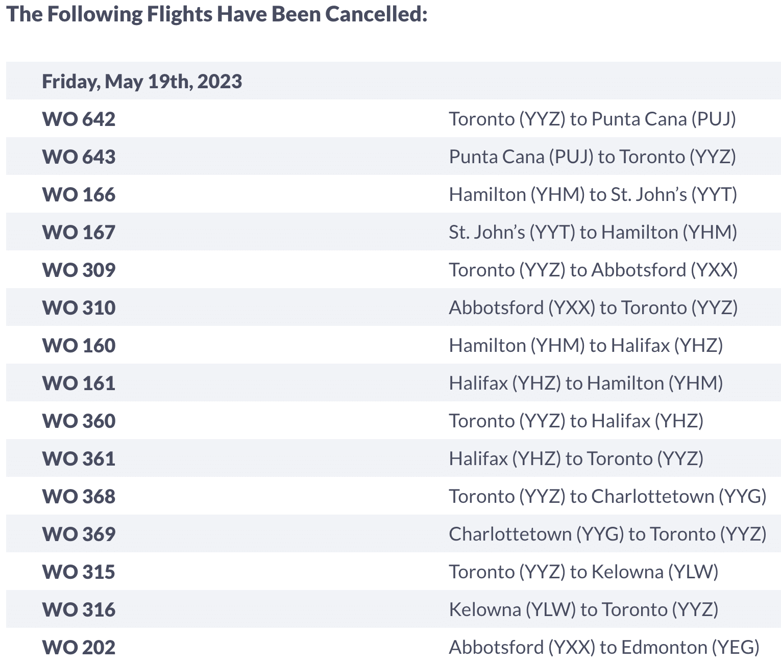A number of WestJet and Swoop flights were cancelled for Friday, May 19, and passengers are advised to check their flight status prior to leaving for the airport.