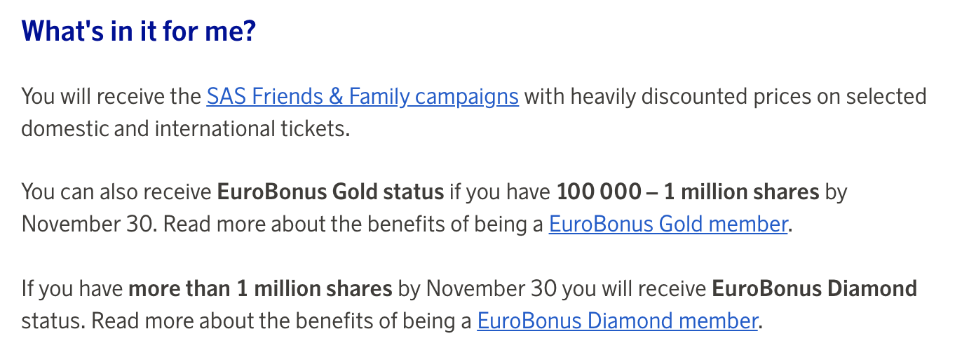 If you own at least 4,000 shares of SAS, you’ll be eligible to participate in SAS Friends & Family campaigns, which are seat sales and deep-discount promotions normally reserved for SAS employees and their friends and families. That can be helpful if you sometimes book cash fares with SAS, but otherwise isn’t too interesting.