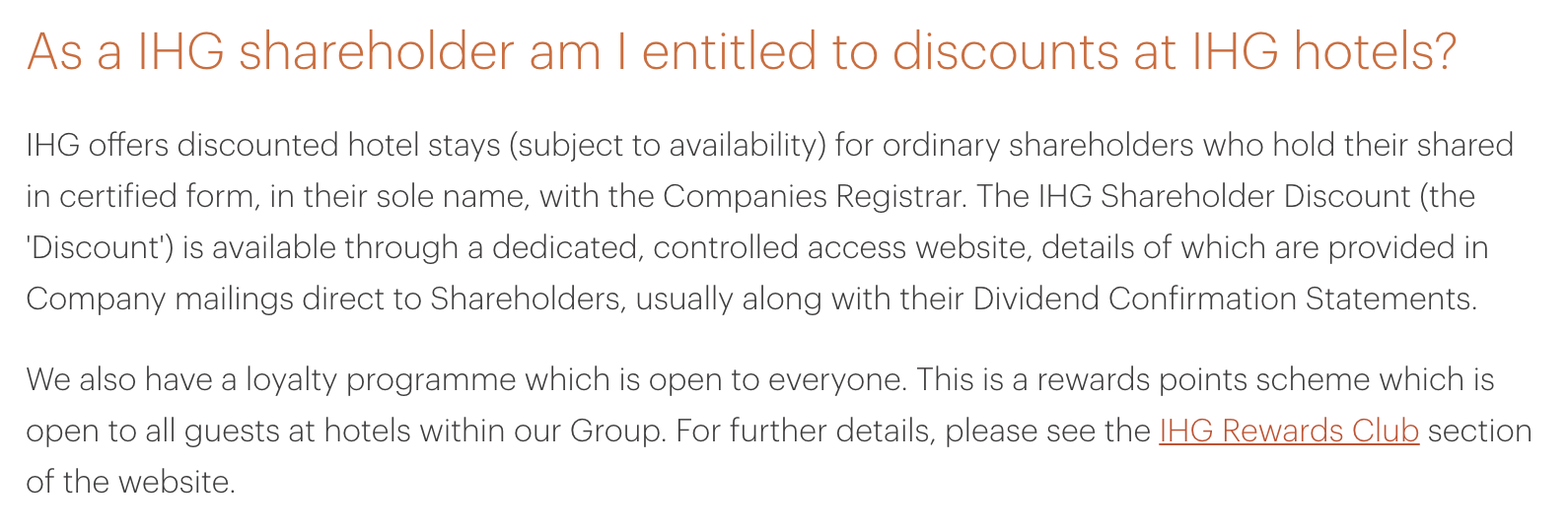 According to the IHG employee, simply booking the member advance purchase rate would probably land you within $5 of the shareholder discount rate, so it’s probably not worth bothering to buy a share of IHG stock unless you genuinely wanted to (perhaps as a result of their *ahem* industry-leading loyalty program).