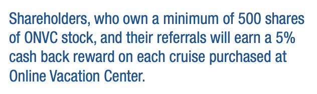 This one’s a bit out of left field: Online Vacation Center, an online travel agency for cruises, also offers shareholder benefits of their own. Anyone who holds at least 500 shares in ONVC (currently trading at US$2.20) will earn 5% in cash back on any cruise purchased through Online Vacation Center.