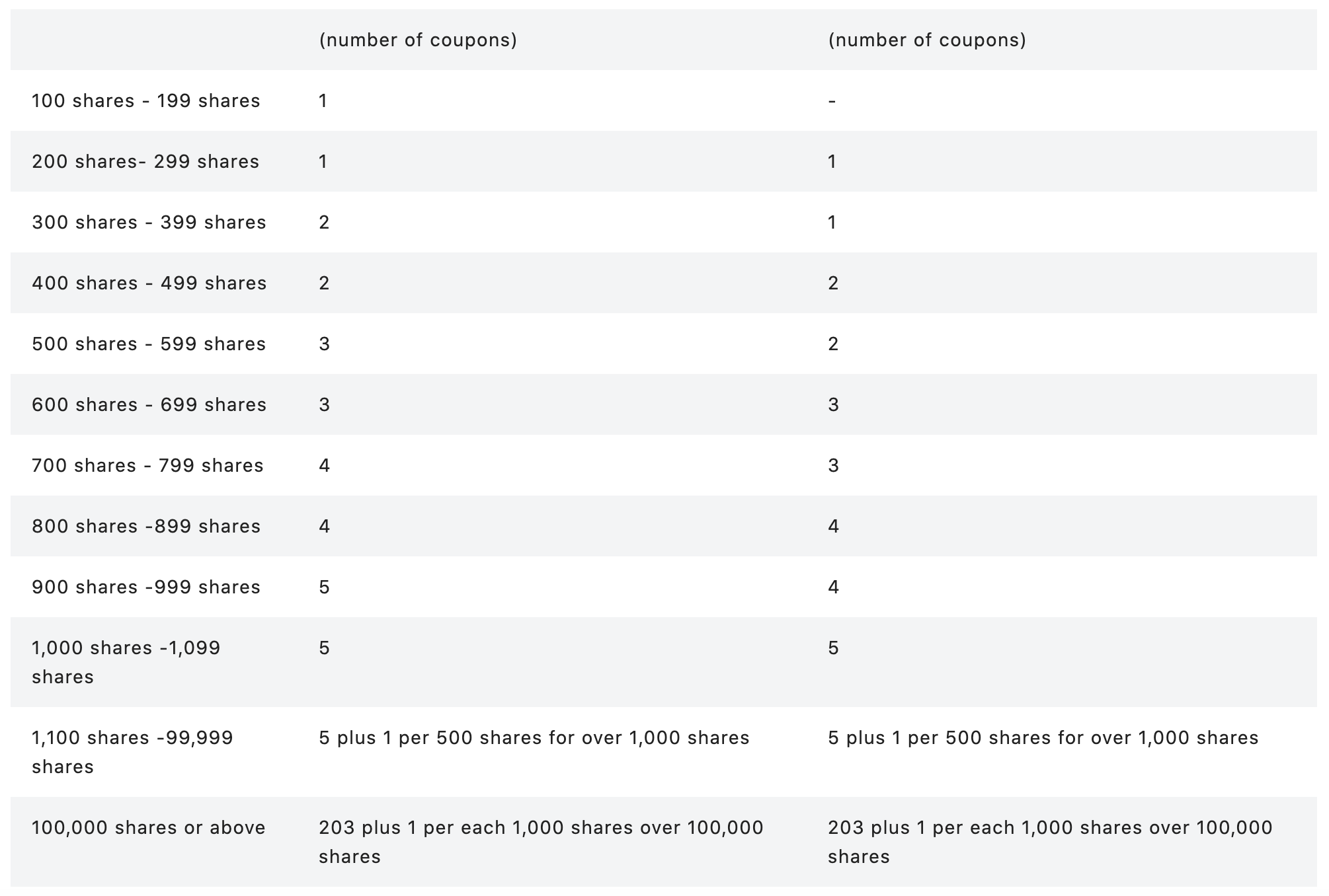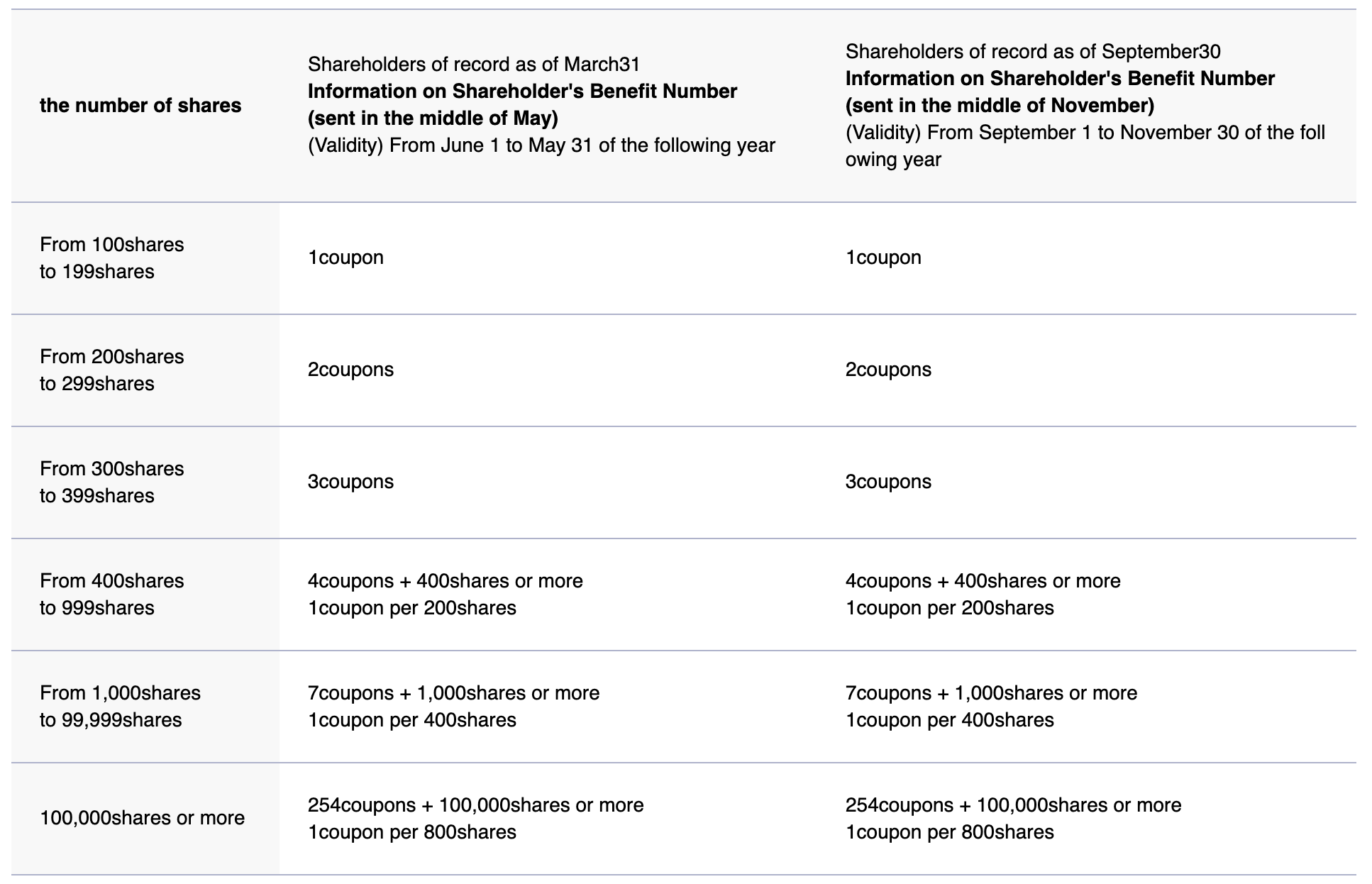 In return, the shareholder is given one or more 50% discount coupons for use on any ANA one-way domestic flight. The minimum 100 shares earns you a single discount voucher, 200 shares earns you two vouchers, and so on: