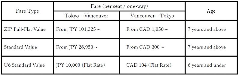 - ZG21 Vancouver (YVR)–Tokyo Narita (NRT), departing 10:30am and arriving 1:30pm the next day