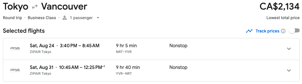 In practice, you should be able to find round-trip flights in business class for under $3,000 (CAD), which is significantly less than pretty much any other carrier that flies between Vancouver and Tokyo.