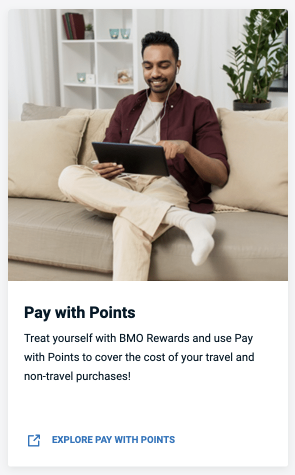 To redeem your points for travel, you can book with any travel provider and then apply BMO Rewards points against the purchases through your BMO Rewards account with the “Pay with Points” tab.