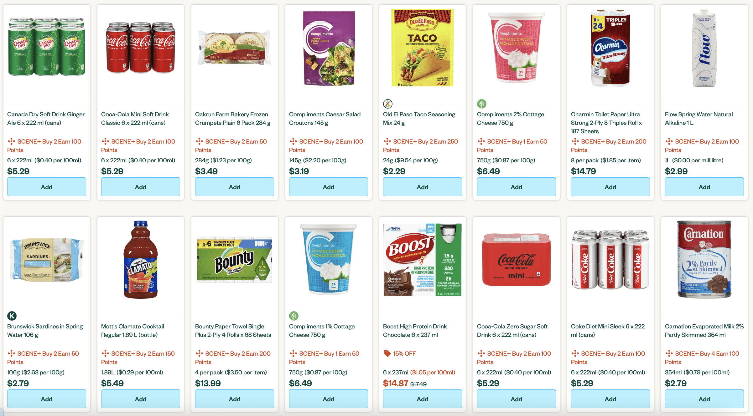 To earn Scene+ points, look for items with an attached points offered. Mostly, the points offers online are the same ones you'd find at a local Empire Company grocery store, such as Sobeys or Safeway.