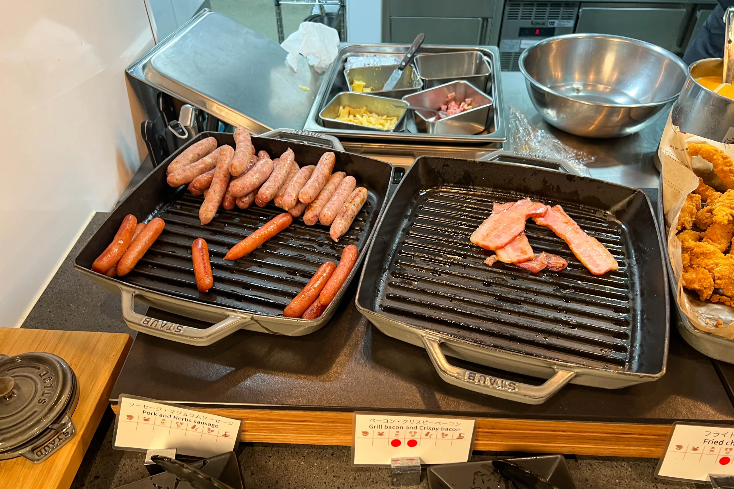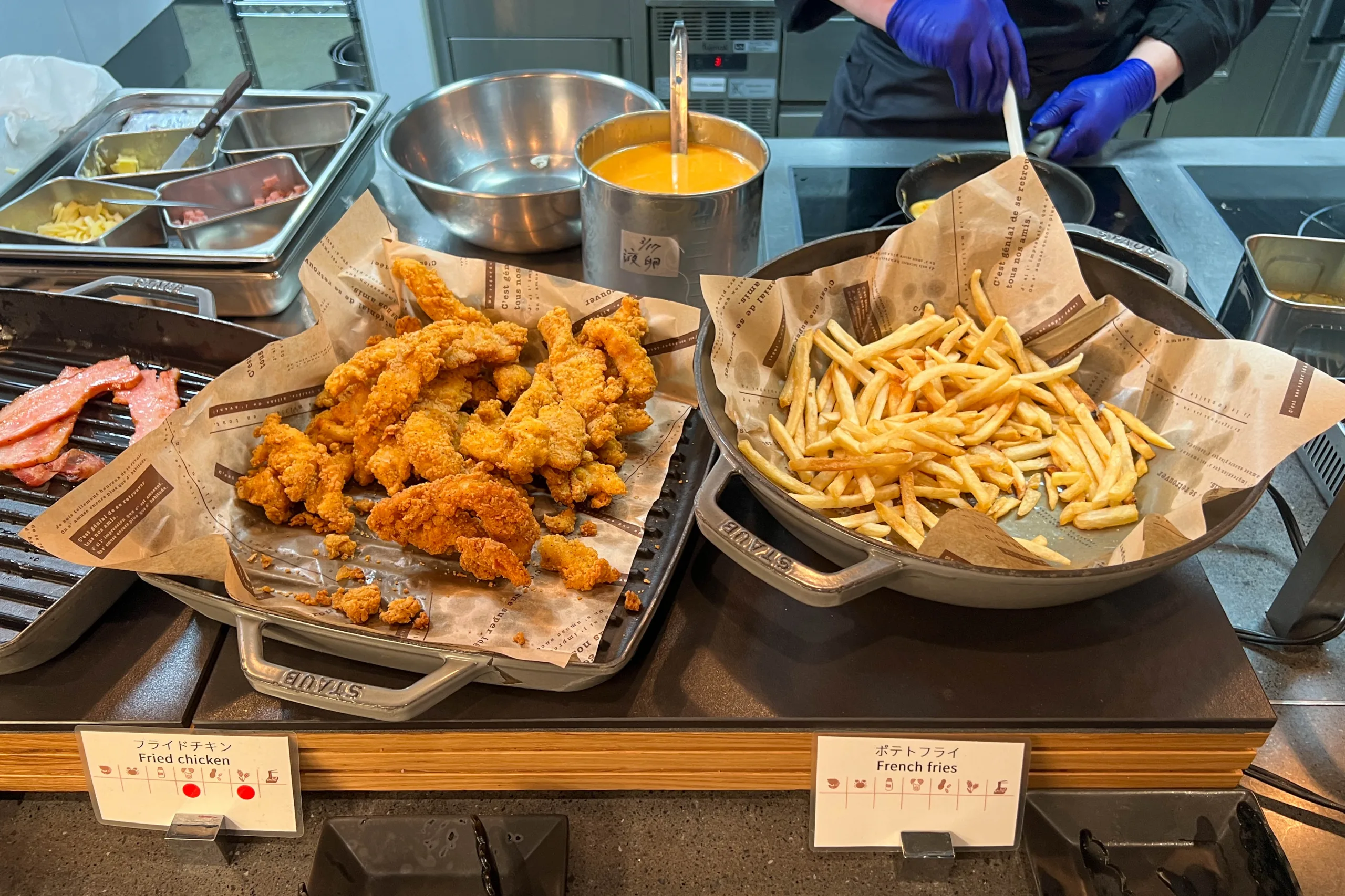 As for the buffet, the cold selections featured a variety of fruits, cereals, salads, and yogurts, while hot items included bacon, sausage, fried chicken, and french fries.