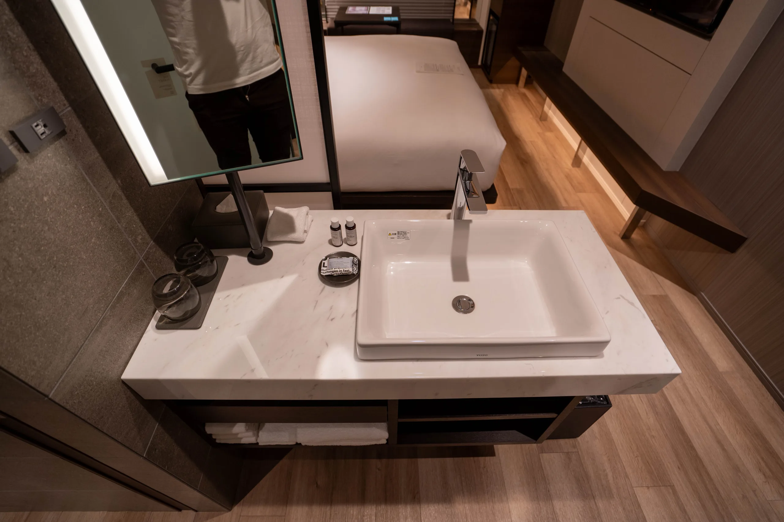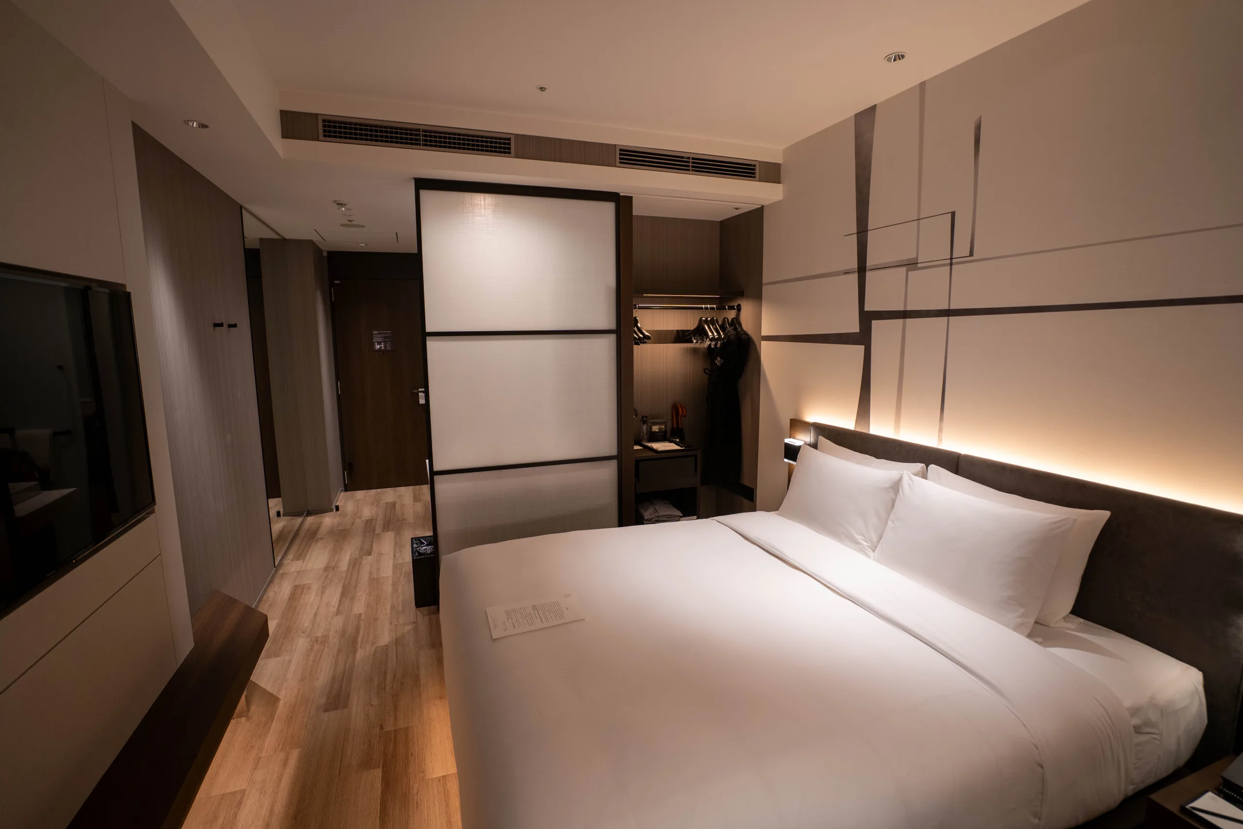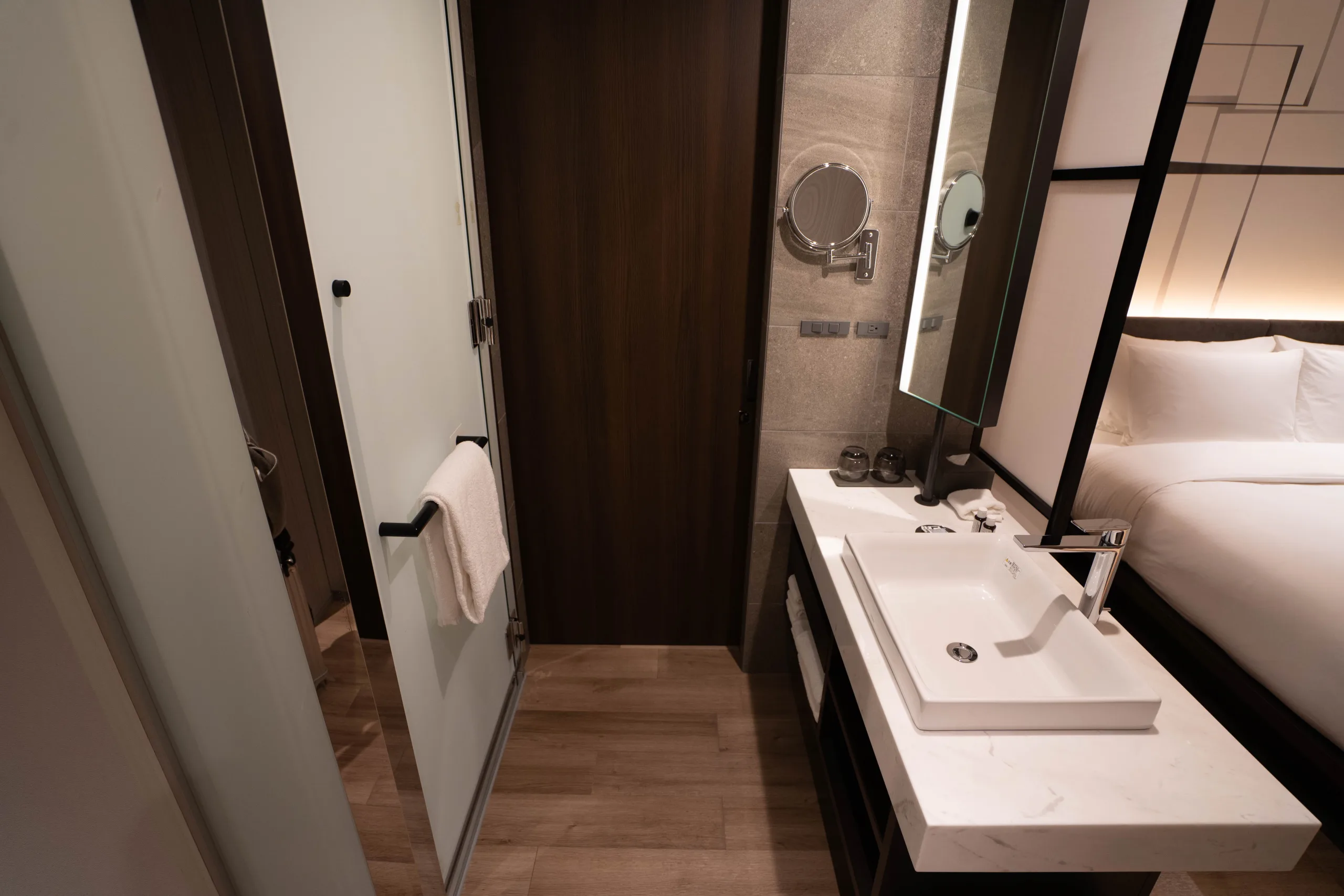 On the opposite side, to the left of the bed, you’ll find a discreet closet, veiled behind a frosted sliding door. Inside, branded plush robes await.