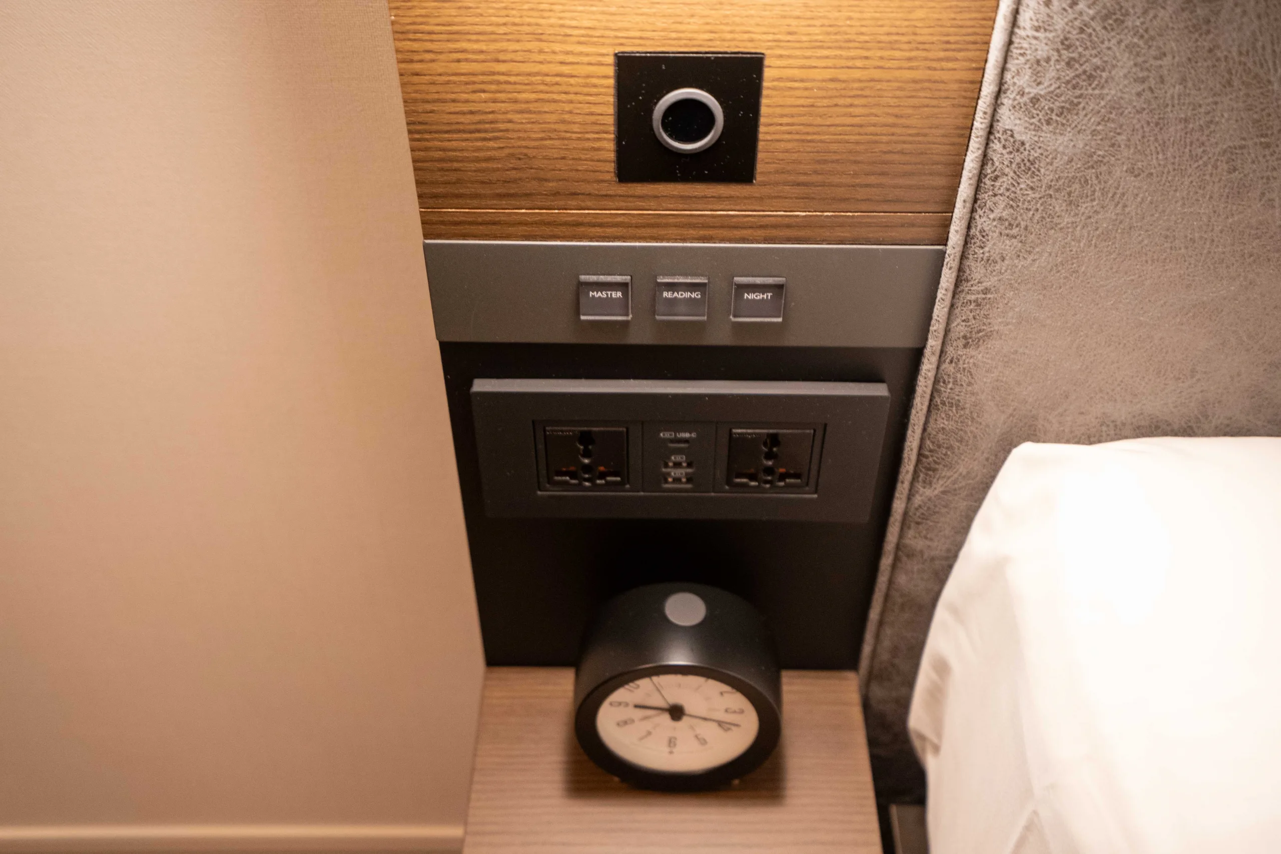 Dominating the bedroom is a king bed, flanked by bedside tables which are thoughtfully fitted with lighting controls, universal charging outlets, and both USB-A and USB-C charging ports.