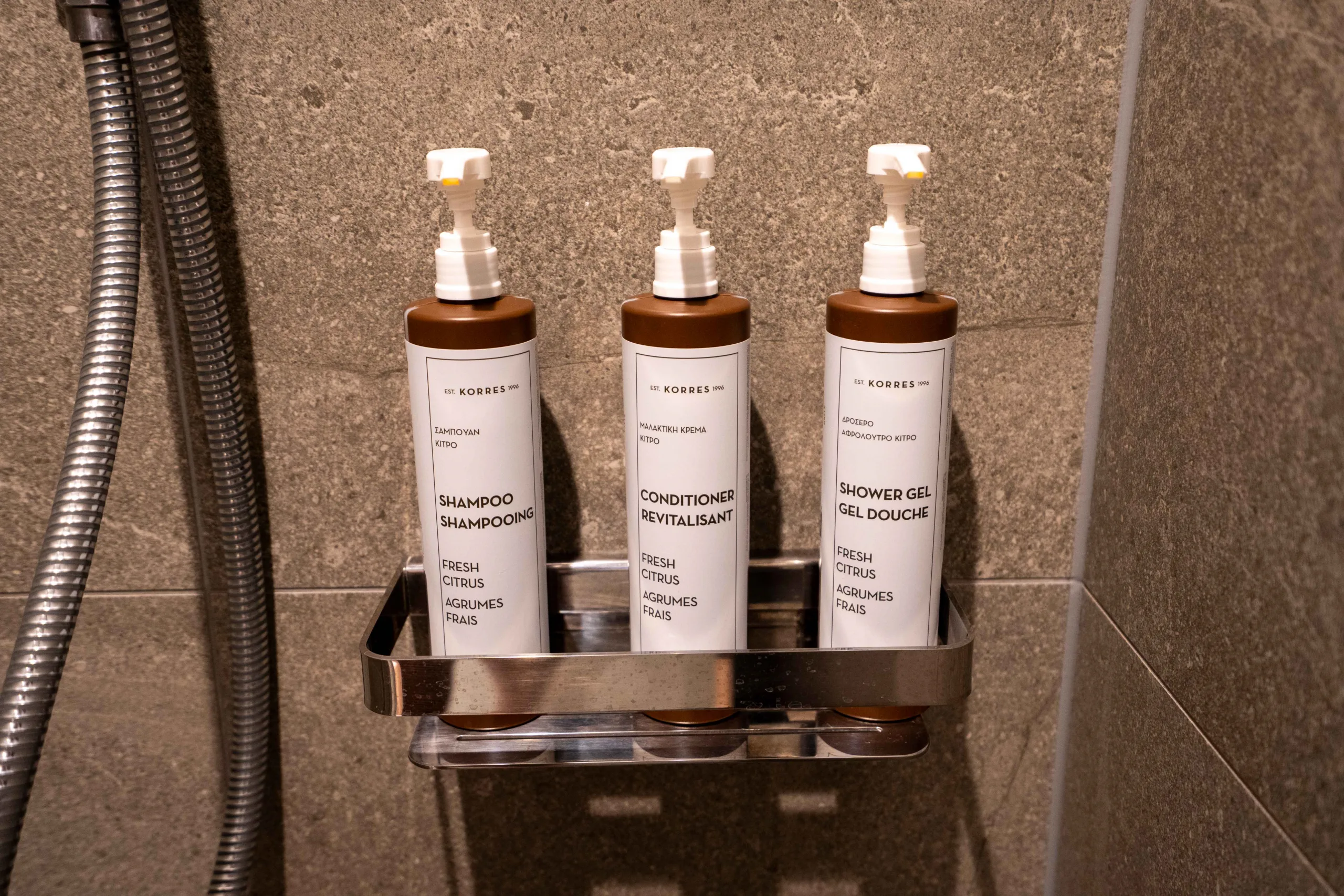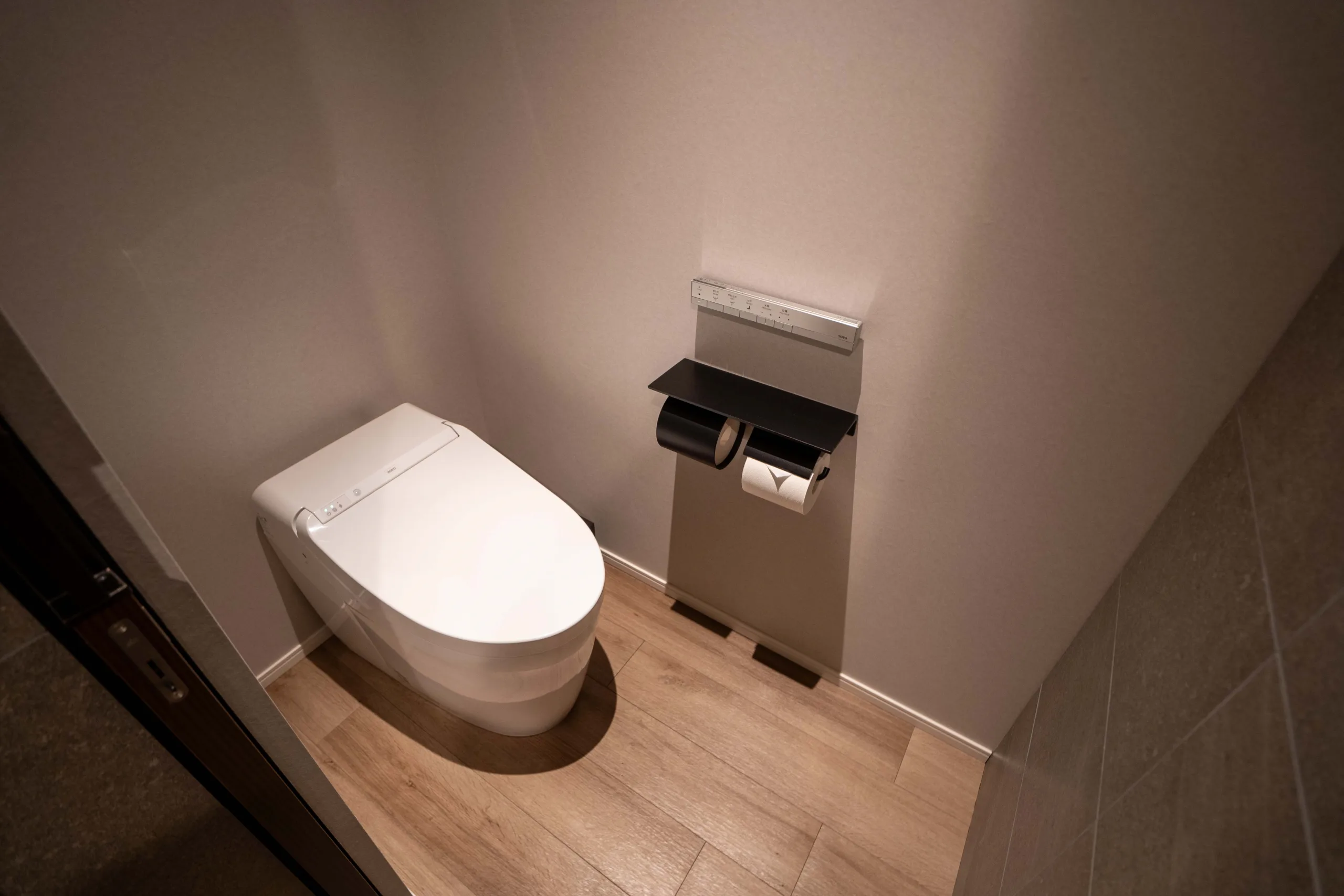 The walk-in shower and the high-tech toilet have their own private enclosures, and the bathroom is adorned with KORRES bathtub amenities.