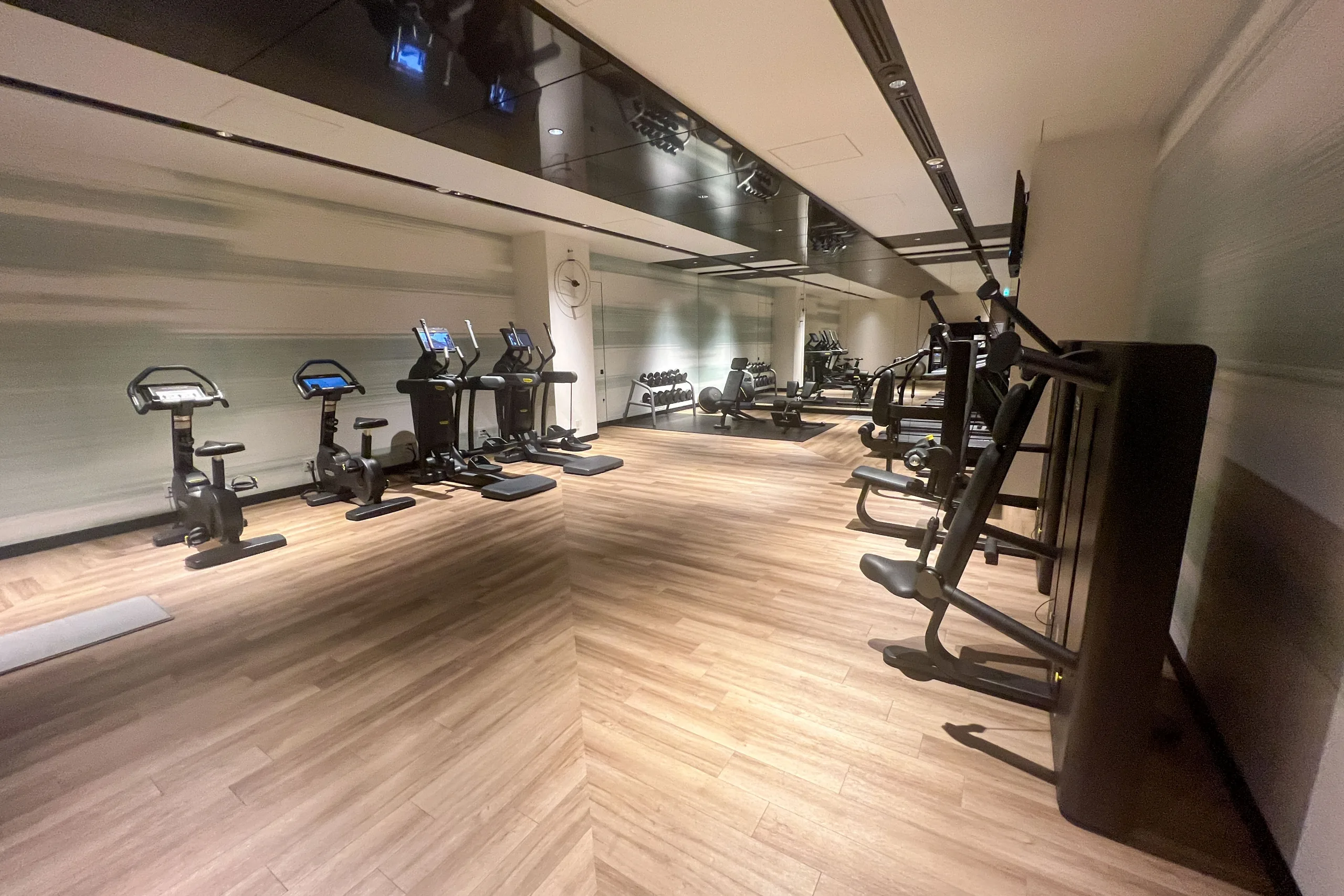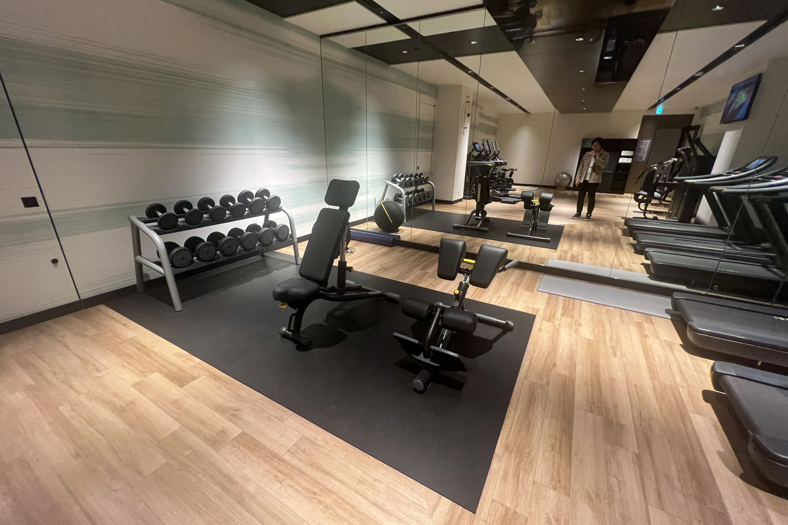 The hotel features a 24-hour fitness that’s impressively stocked with gym equipment. There’s a row of treadmills, as well as a dedicated section for strength training, complemented by free weights.