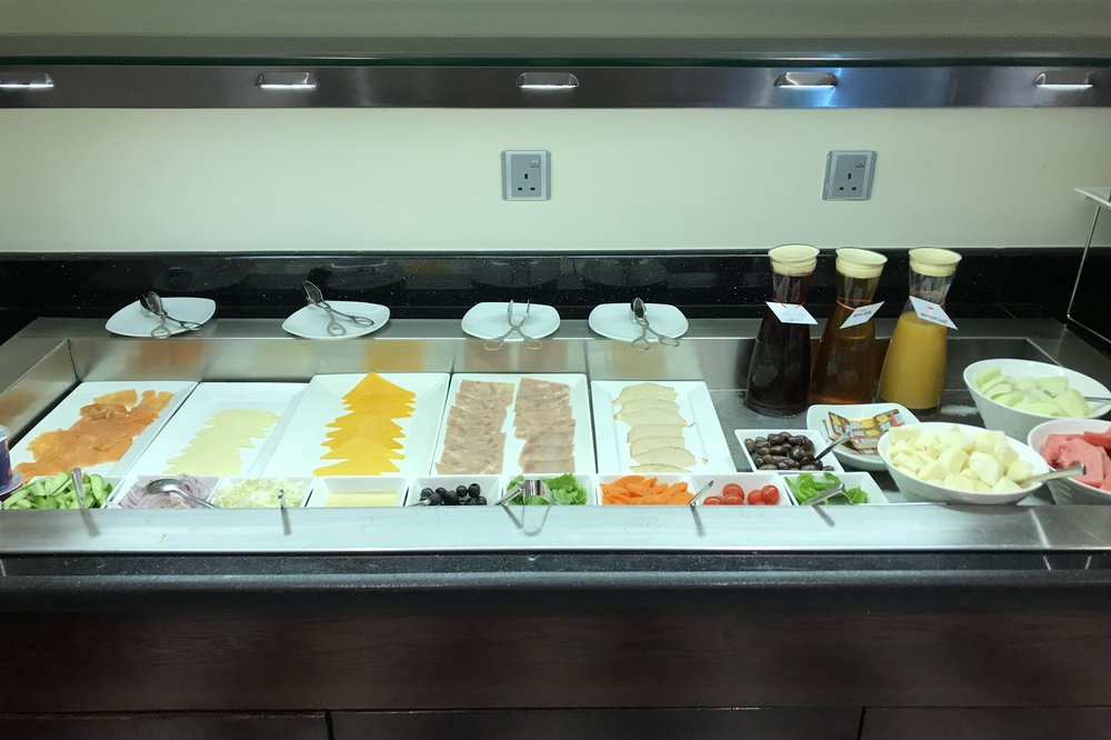 When food isn’t being served, the lounge has a small spread of grab-and-go drinks set up, as well as coffee and tea on hand.