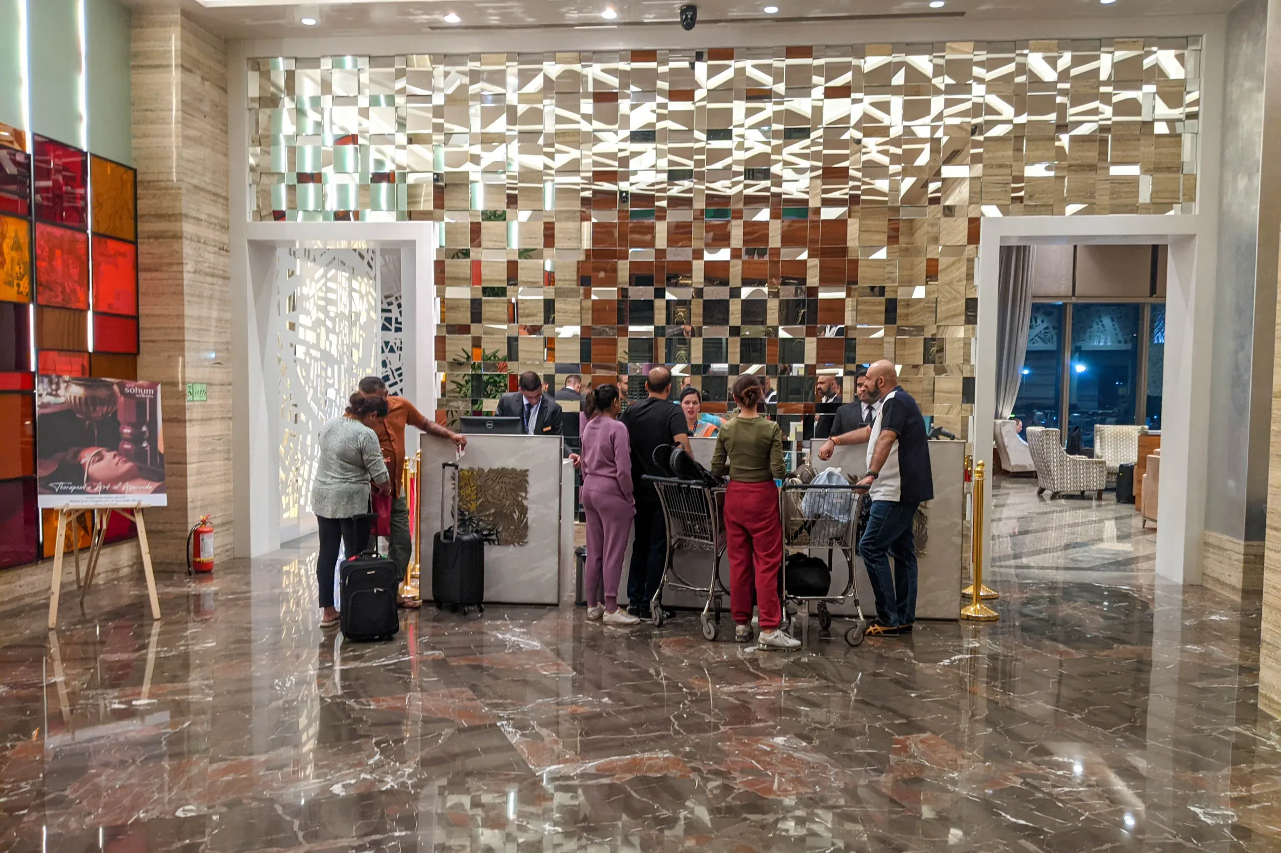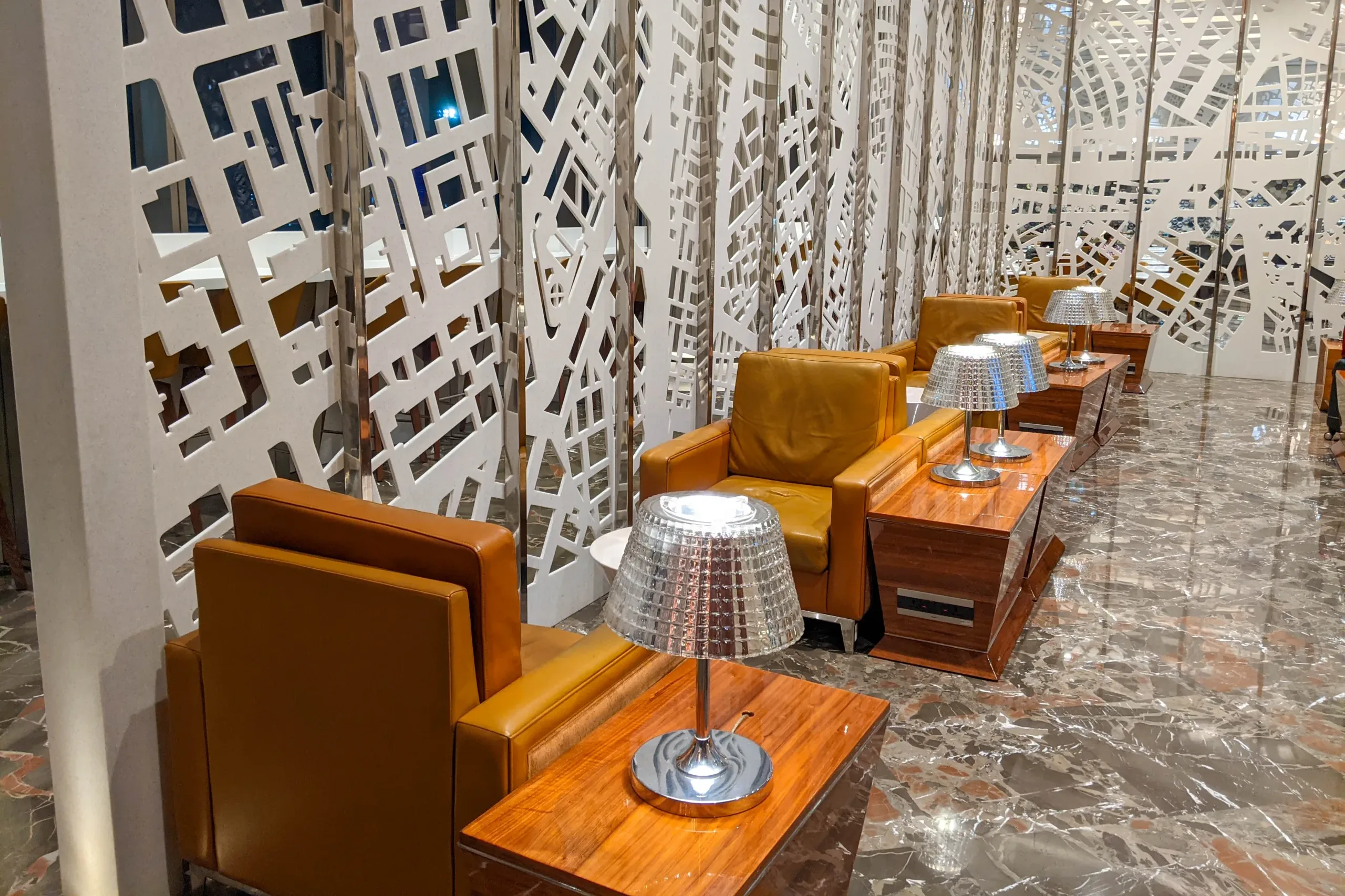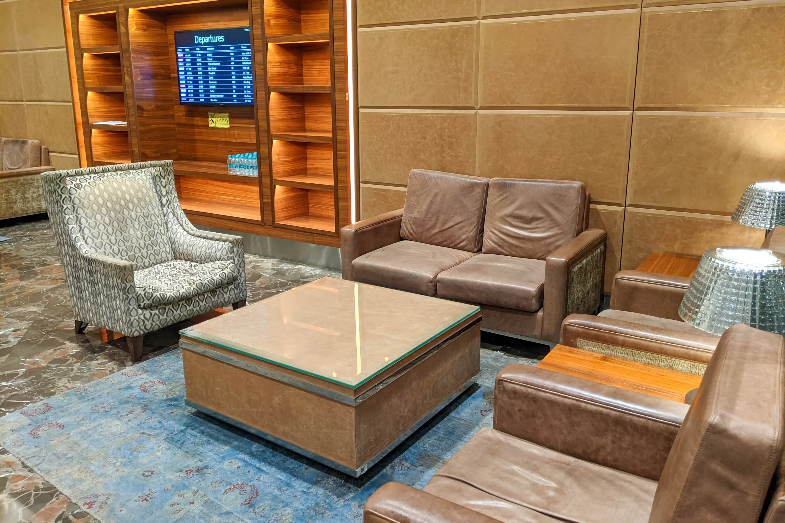 The interior of the lounge is fairly posh, with high ceilings and a colour palette that predominantly features rich brown and neutral earthy tones.