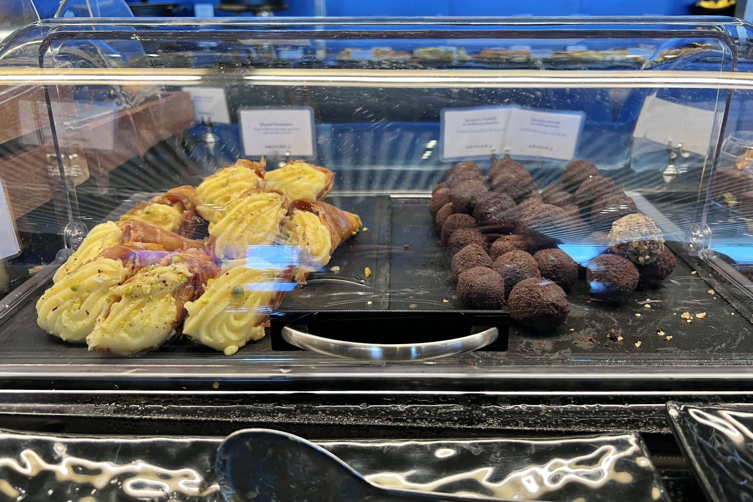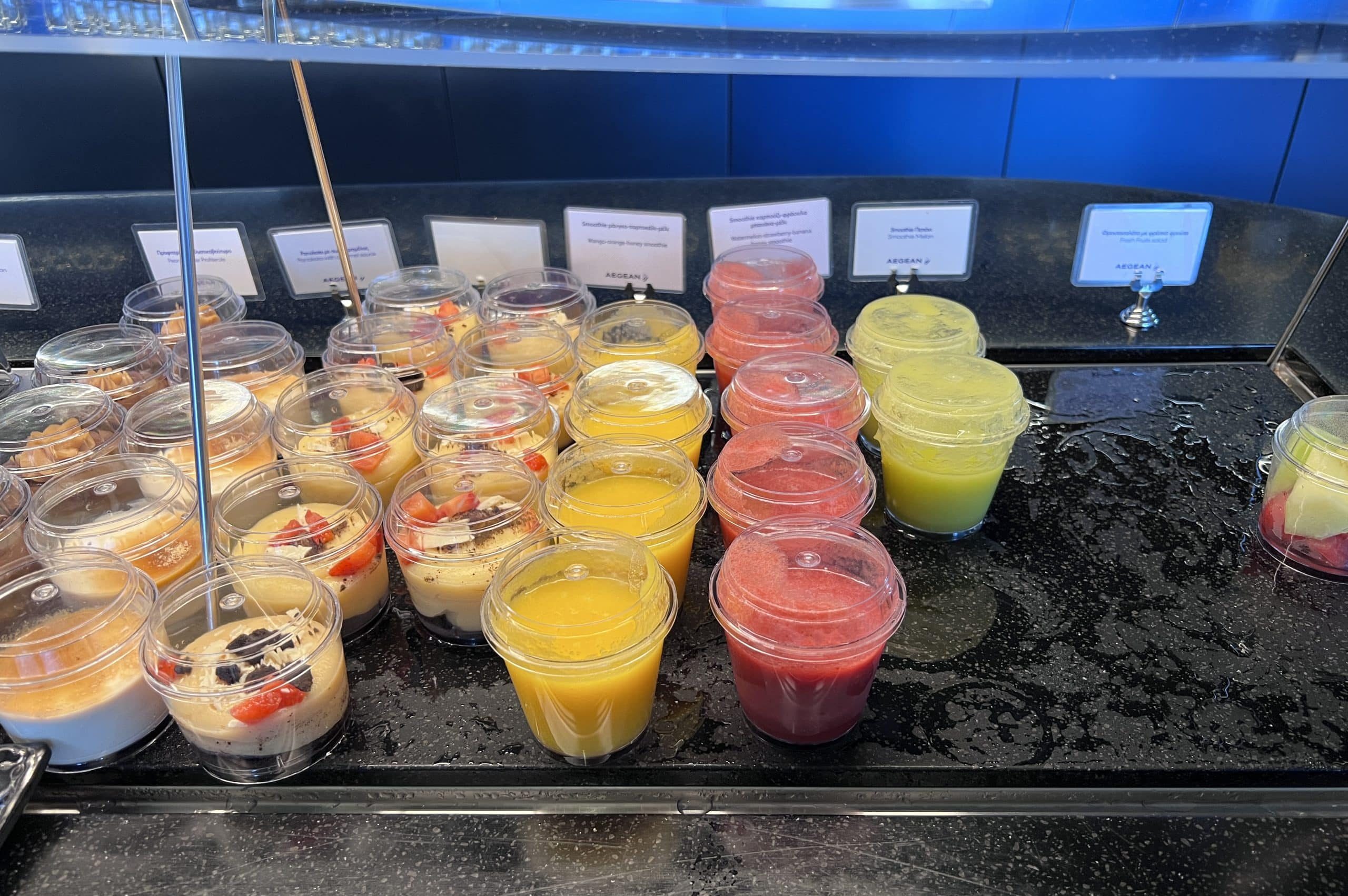 If you have a carb craving to satisfy, choose from a selection bread, bagels, croissants, coffee cakes, doughnuts, cookies, granola bars, and other Greek desserts. Healthier options, such as fresh smoothies and fresh cut fruit, are also available.