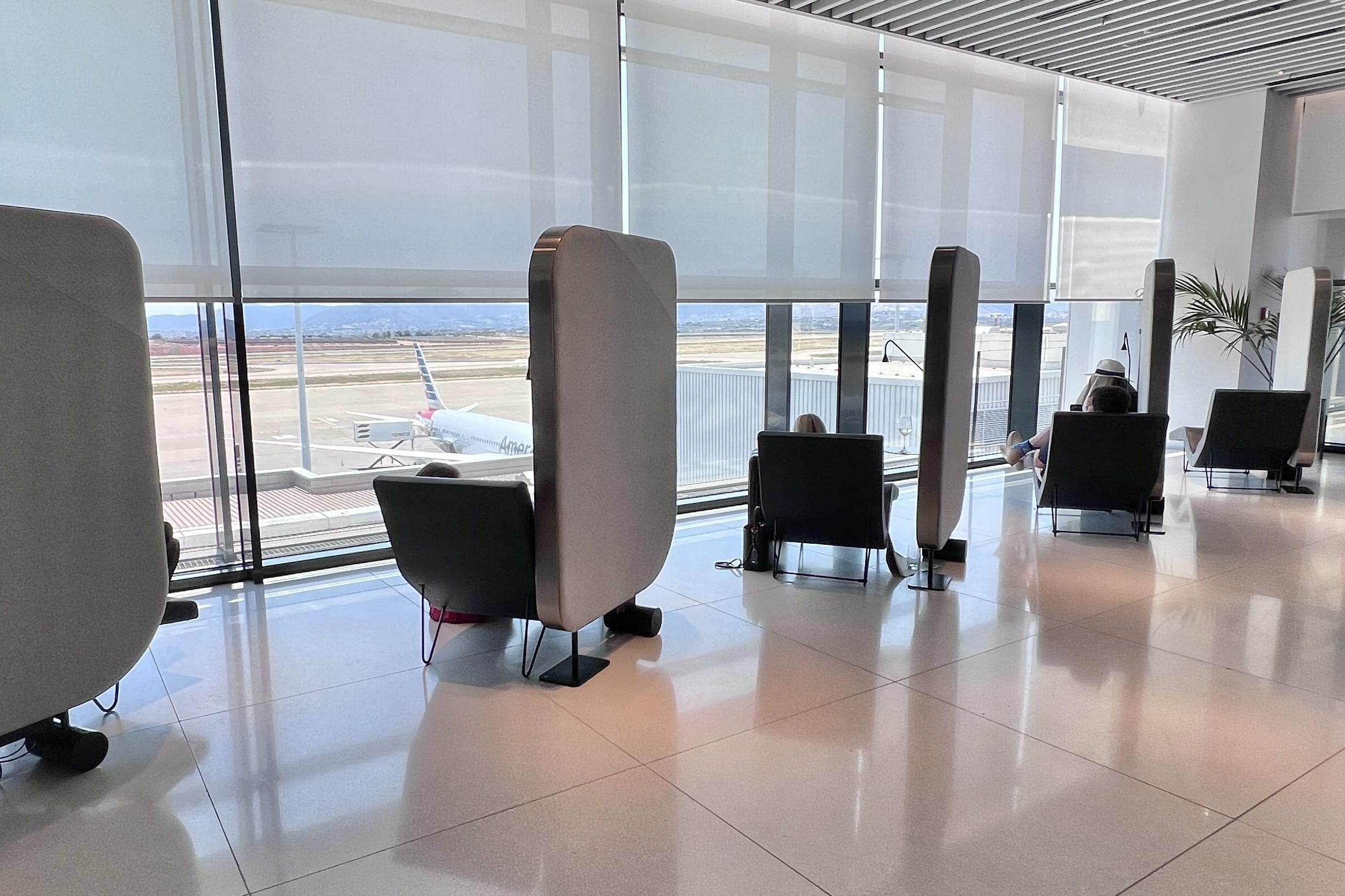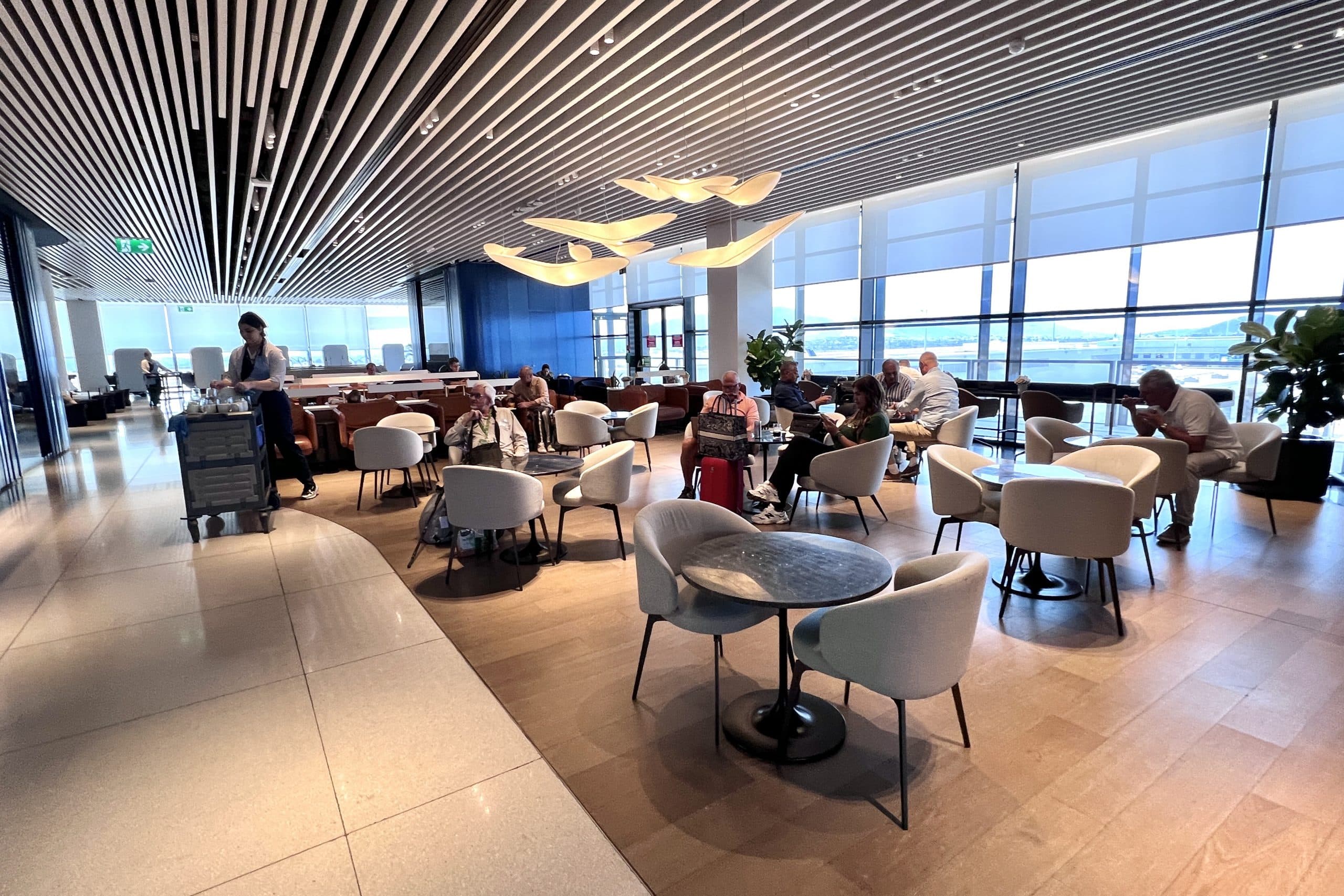 When you enter the lounge, the first thing you’ll notice is that it’s spacious and bright. The brightness is in part due to the floor-to-ceiling windows around the lounge that overlook the apron and taxiways.