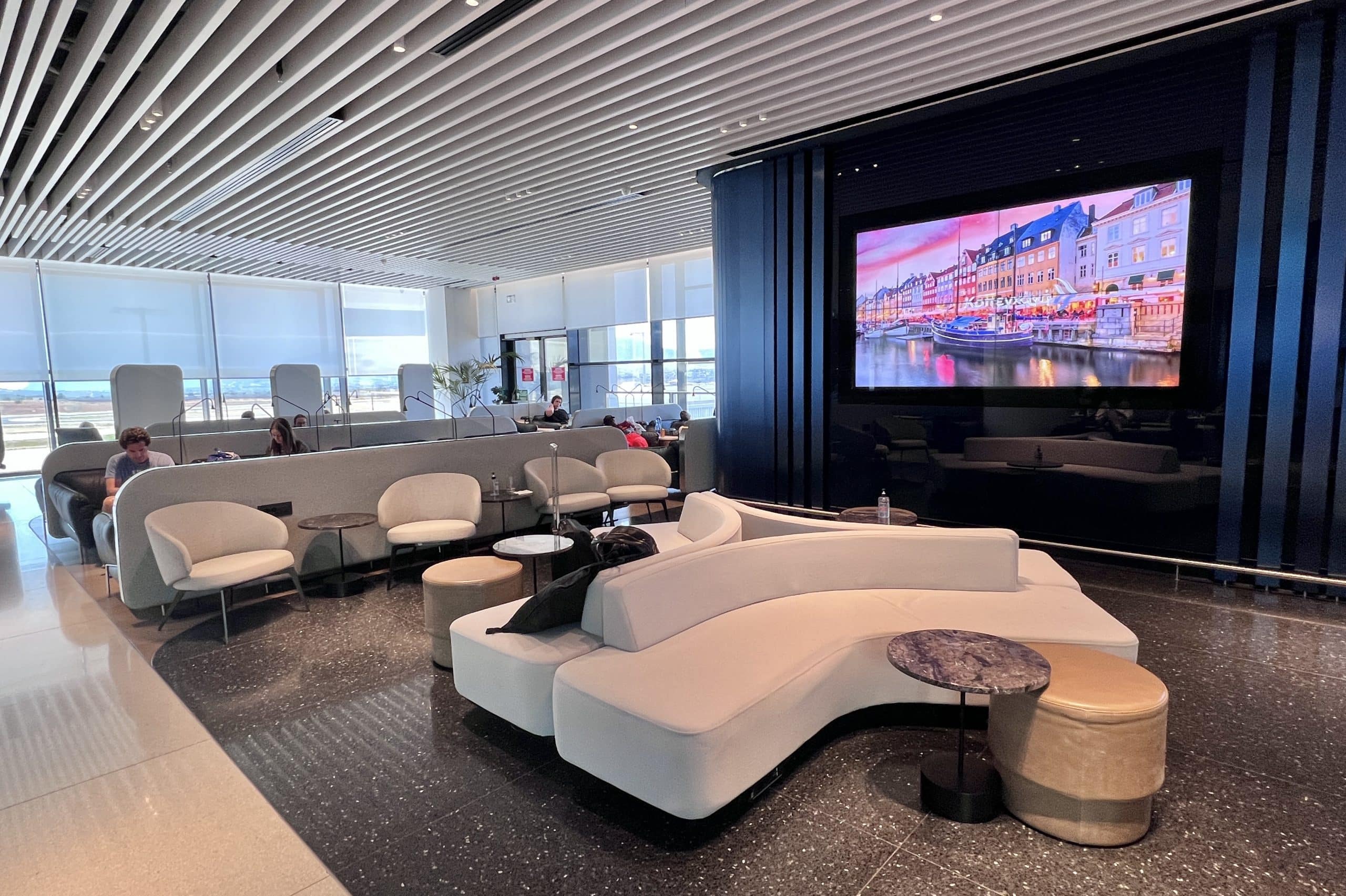 The central lounge area is the largest open space, with plenty of curved couches and armchairs situated throughout. At the far end of this area is a flight information display screen.