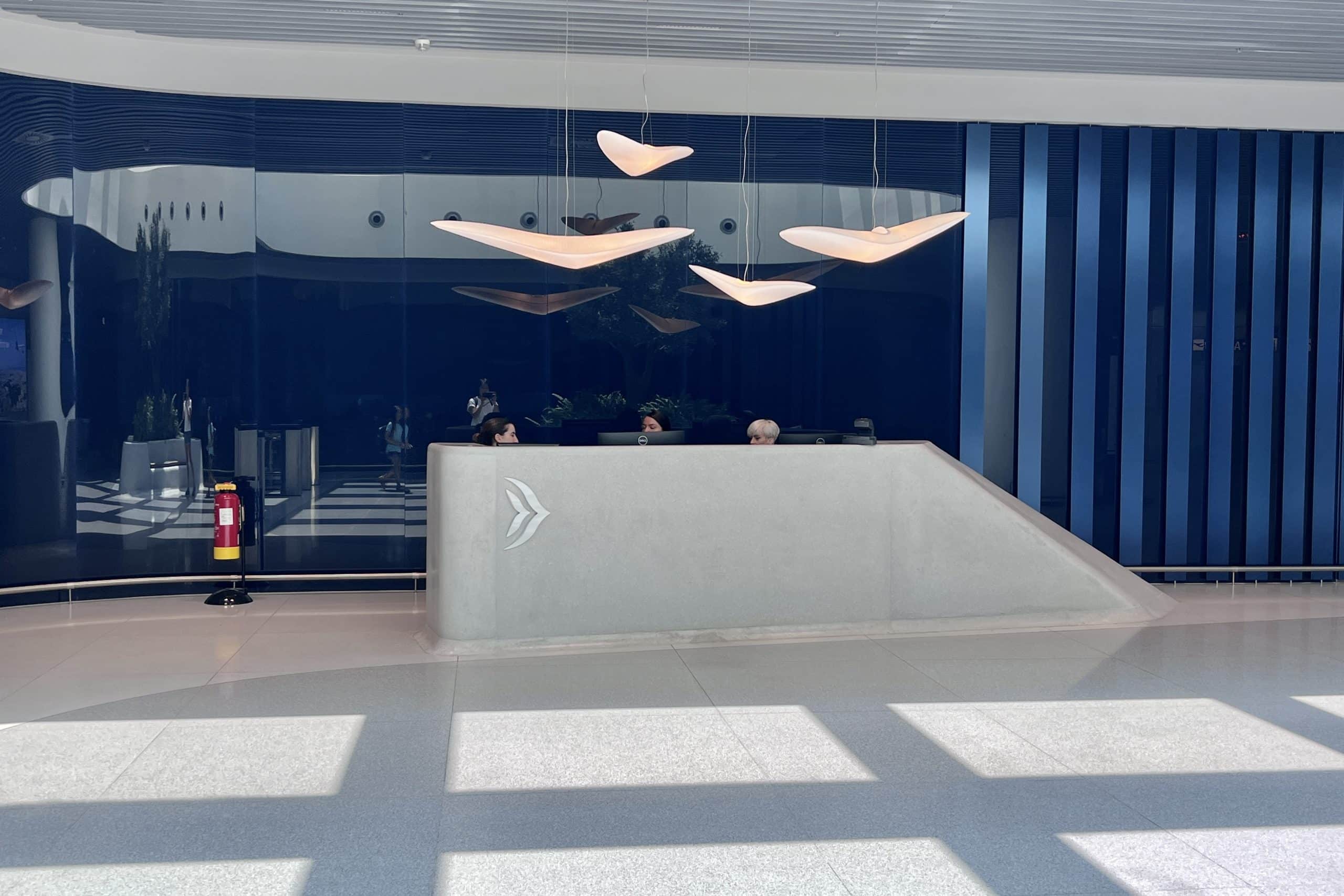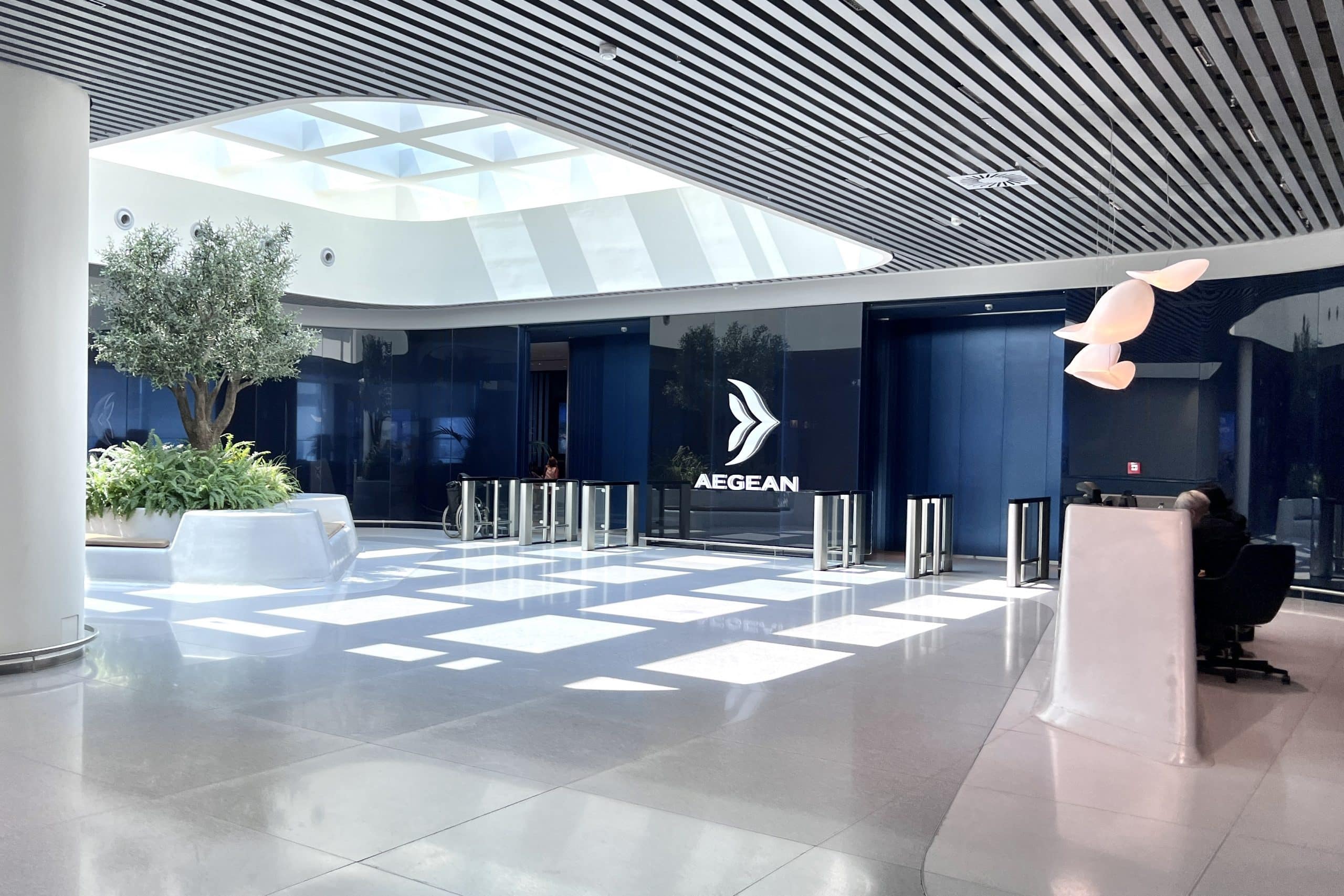 The dark blue against the stark white floors and surrounding walls really draws your attention towards the entrance, while the white floating motifs that represent flying gulls work well in portraying Aegean’s logo and identity.
