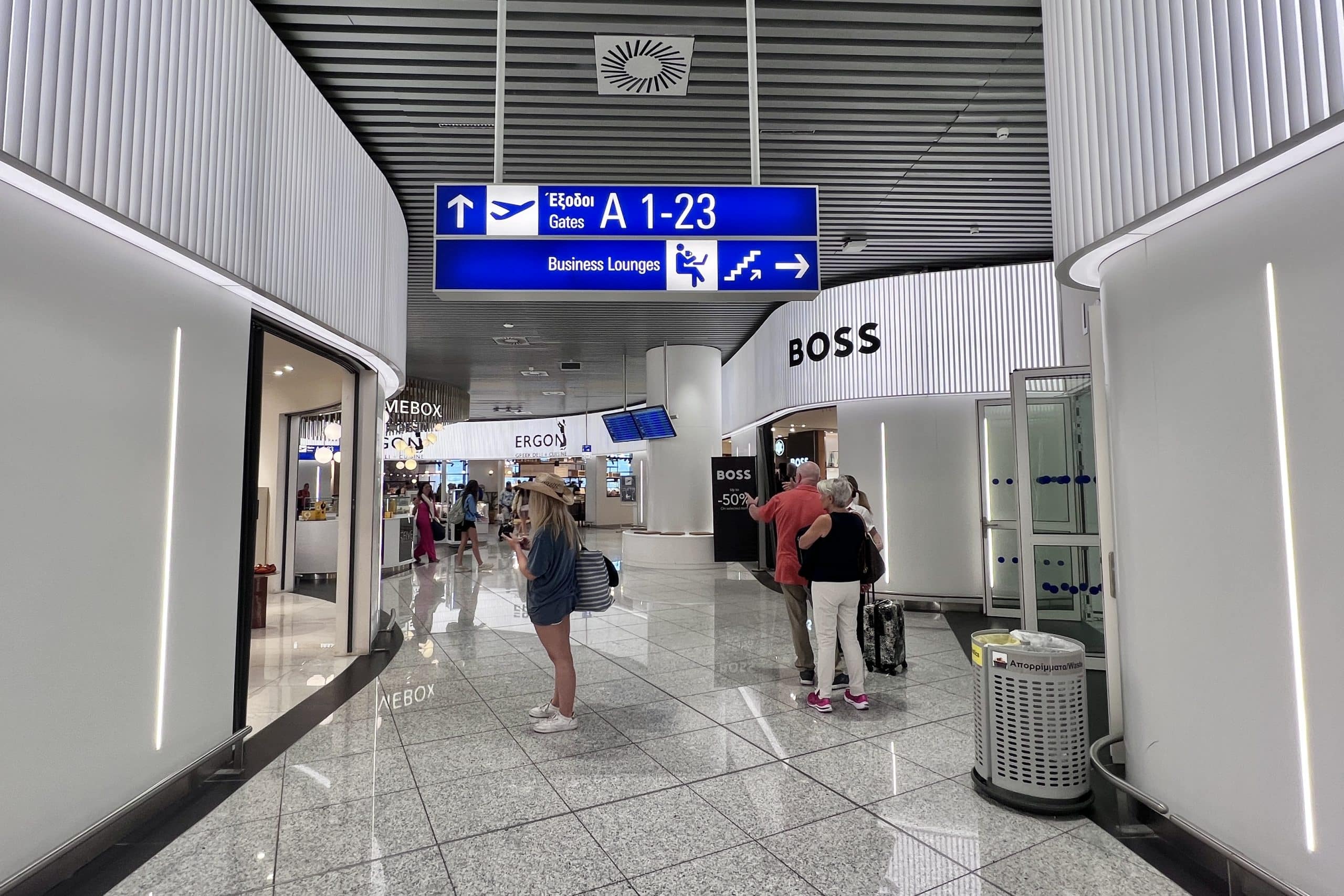 After security, walk through the duty free shop. As you exit the shop, you’ll enter the hallway that takes you to the A Gates, and you’ll see an overhead sign directing you to “Business Lounges”, located just before the Hugo Boss store.