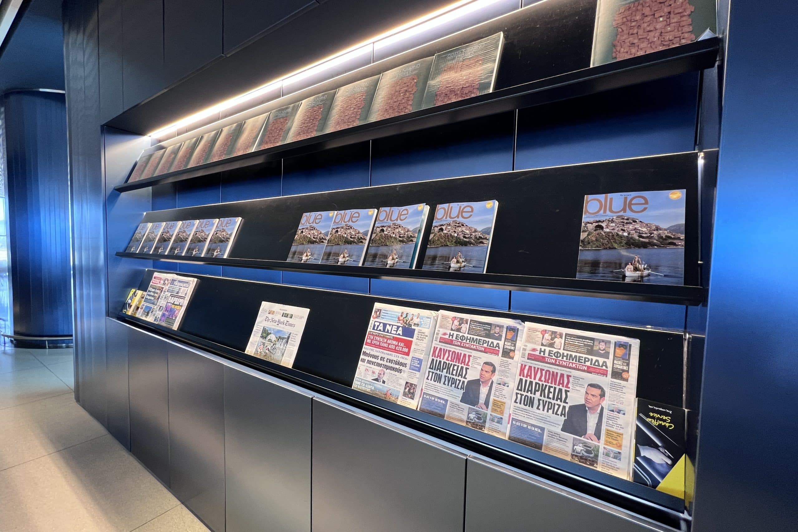 The lounge opened in April 2022, with the aim of providing a relaxing retreat with state-of-the-art features that promotes Greek culture through its architecture, décor, and food.