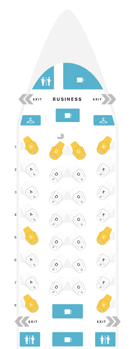The seats are arranged in a reverse herringbone pattern, meaning you face away from the aisle. The seats are angled, giving every business class passenger extra legroom and personal space.